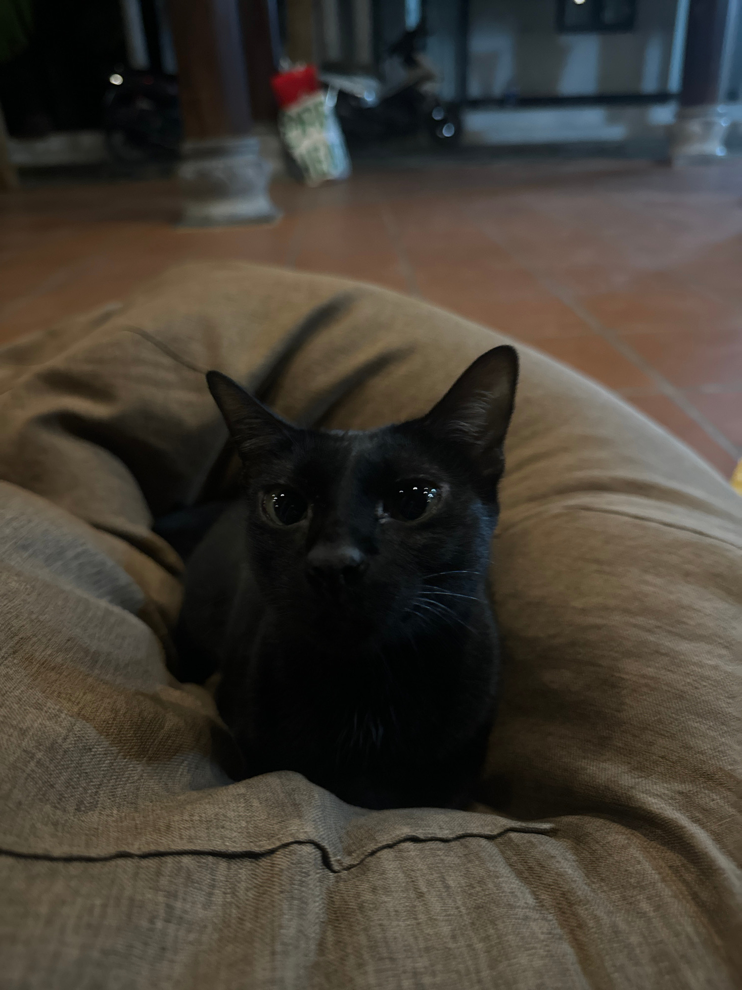 A close-up photograph shows a black cat nestled within the folds of what appears to be a tan or light brown fabric. The cat's head is prominent, with large, reflective eyes gazing directly at the came…read more
