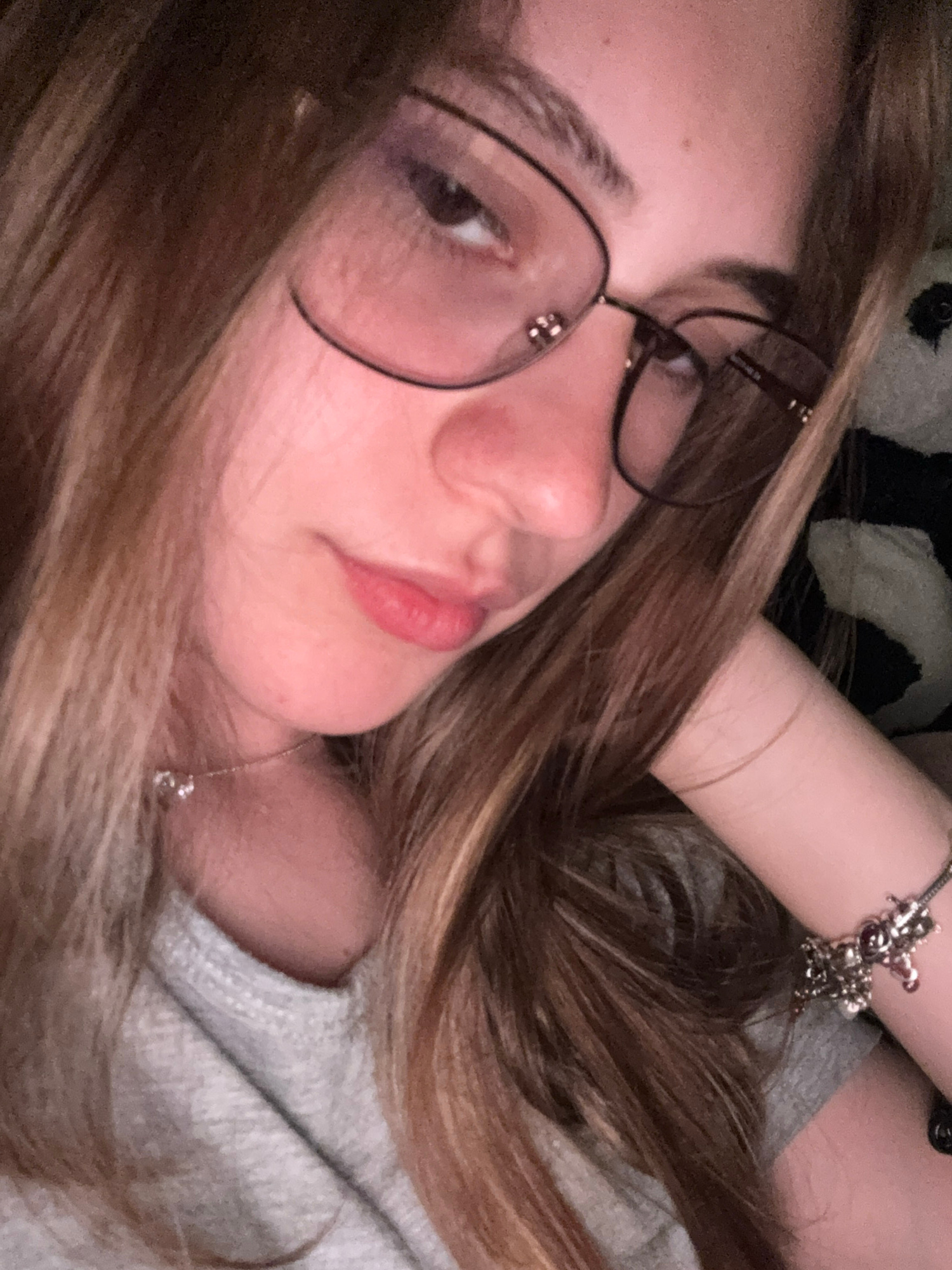 A close-up, slightly angled portrait features a young woman lying down in what appears to be an indoor setting. Her long, light brown hair, with subtle reddish undertones, frames her face and spreads…read more