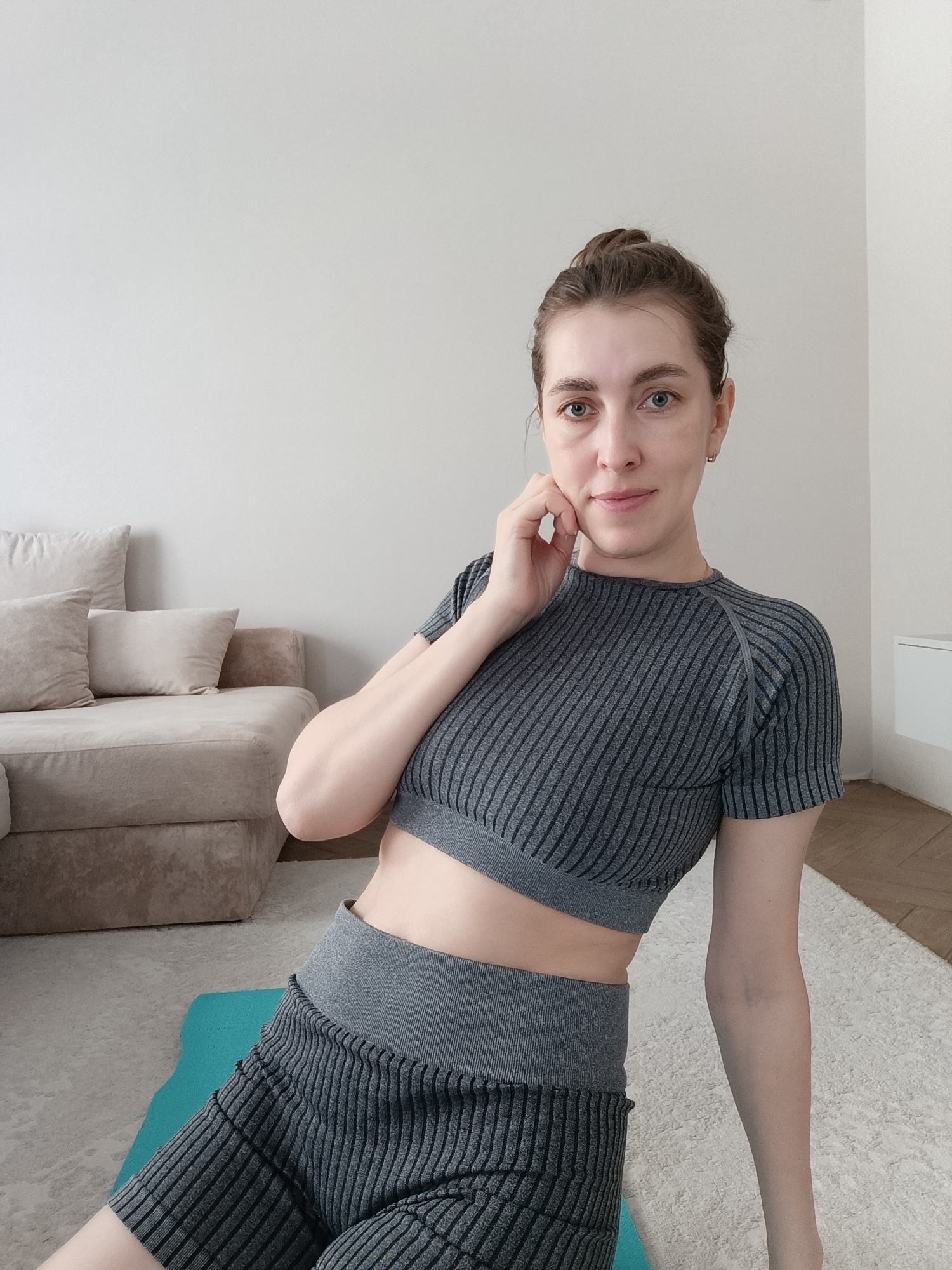 A woman is shown in a medium indoor shot, seated on a blue yoga mat that is placed on a white rug. She is wearing a grey, striped exercise outfit consisting of a crop top and shorts. She is partially…read more