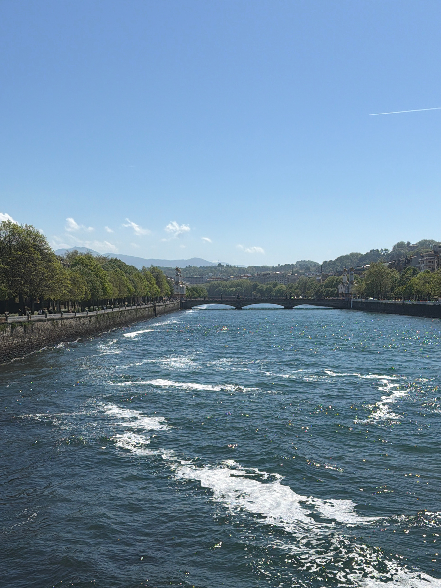 The image displays a sunny, daytime view of a river or bay in a city, likely San Sebastián, Spain. The right half of the frame is filled with the shimmering, blue-grey water, characterized by numerous…read more