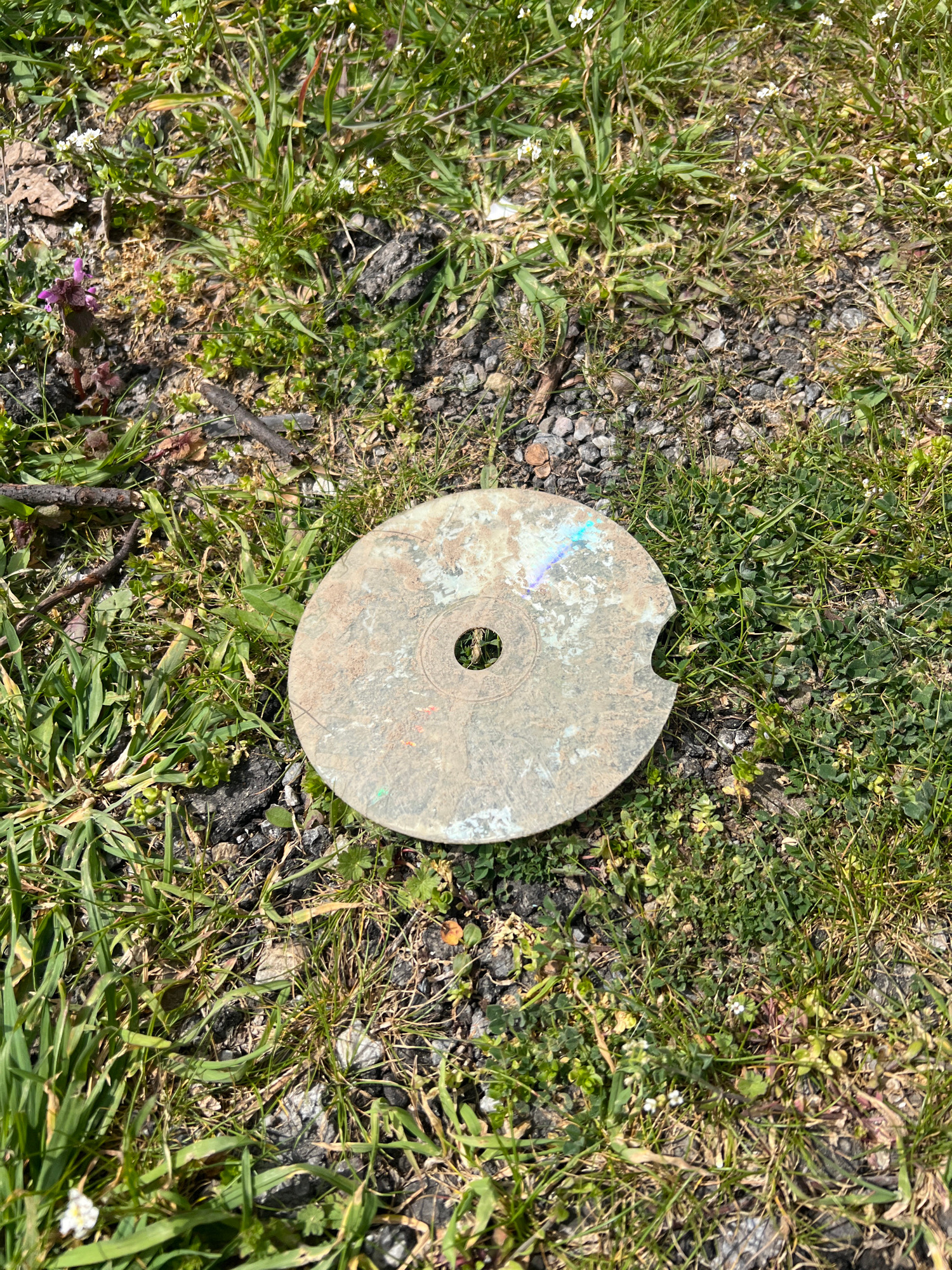 A top-down shot shows a heavily weathered CD lying on a patch of mixed grass, small pebbles, and weeds. The CD is mostly gray with dirt and scratches covering the surface, and a piece is broken off onβ¦read more