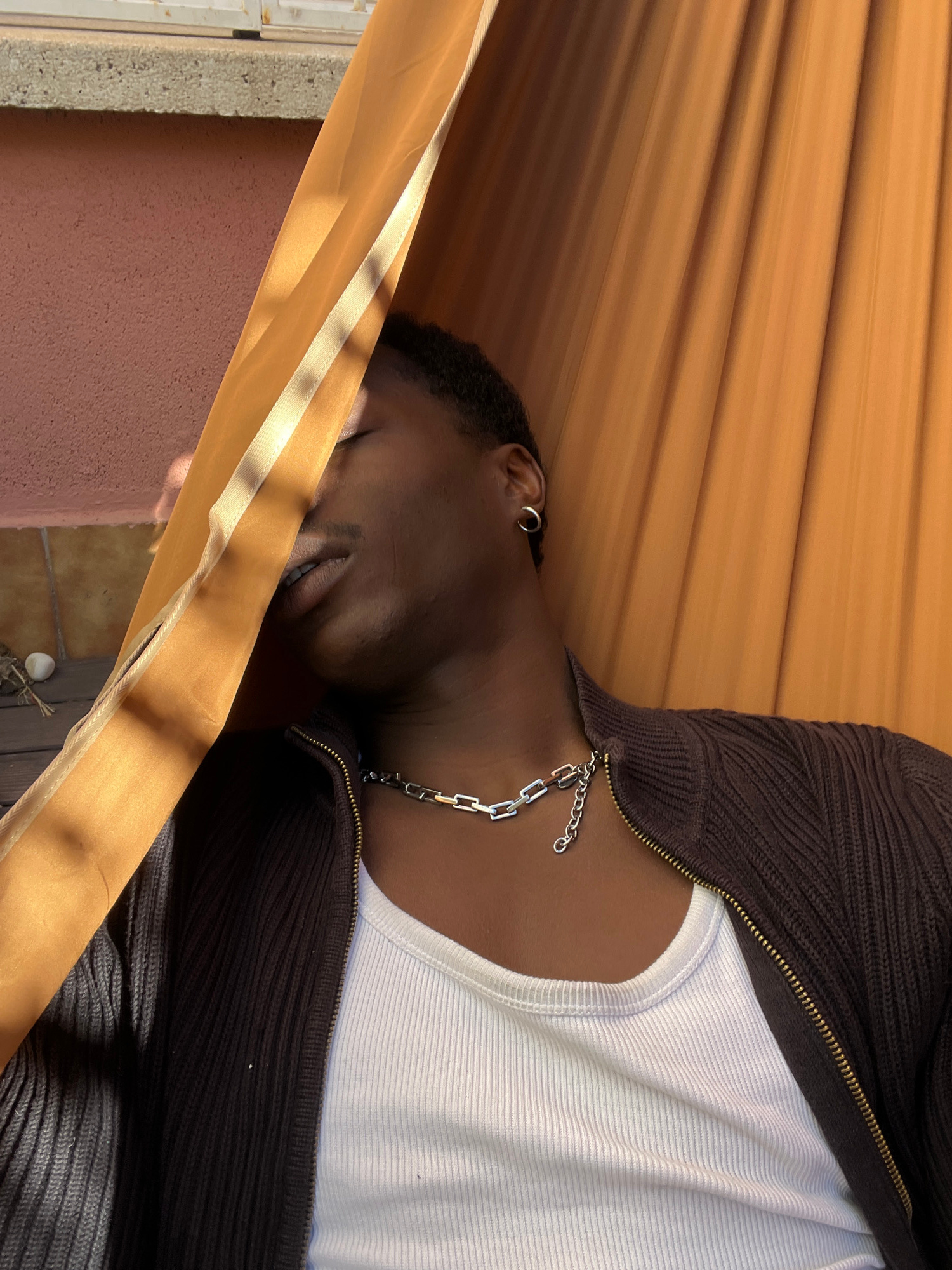 A person with short, dark hair, a silver hoop earring in their left ear, and a silver chain necklace is visible in the image. They are wearing a white ribbed tank top and a dark brown ribbed cardigan…read more