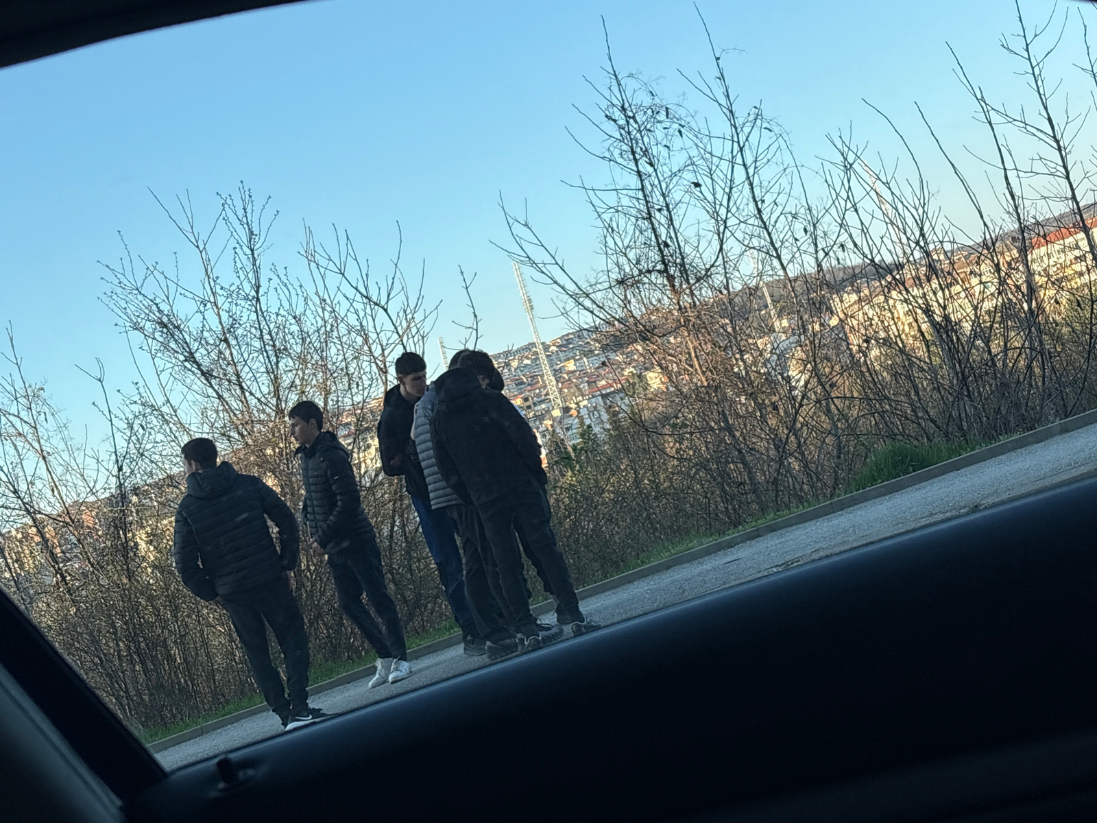The image shows five young men standing on a roadside in Veliko Tarnovo, Bulgaria. The men are all dressed in casual clothes. A background shows a cityscape with buildings and what appears to be a sta…read more