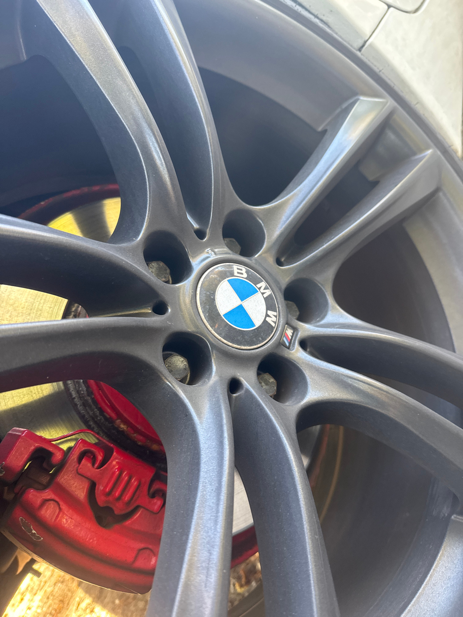 A close-up shot of a BMW wheel and brake assembly. The wheel is gray with a multi-spoke design and the BMW logo at the center. The brake caliper is red and shows signs of wear. A metallic rotor is vis…read more