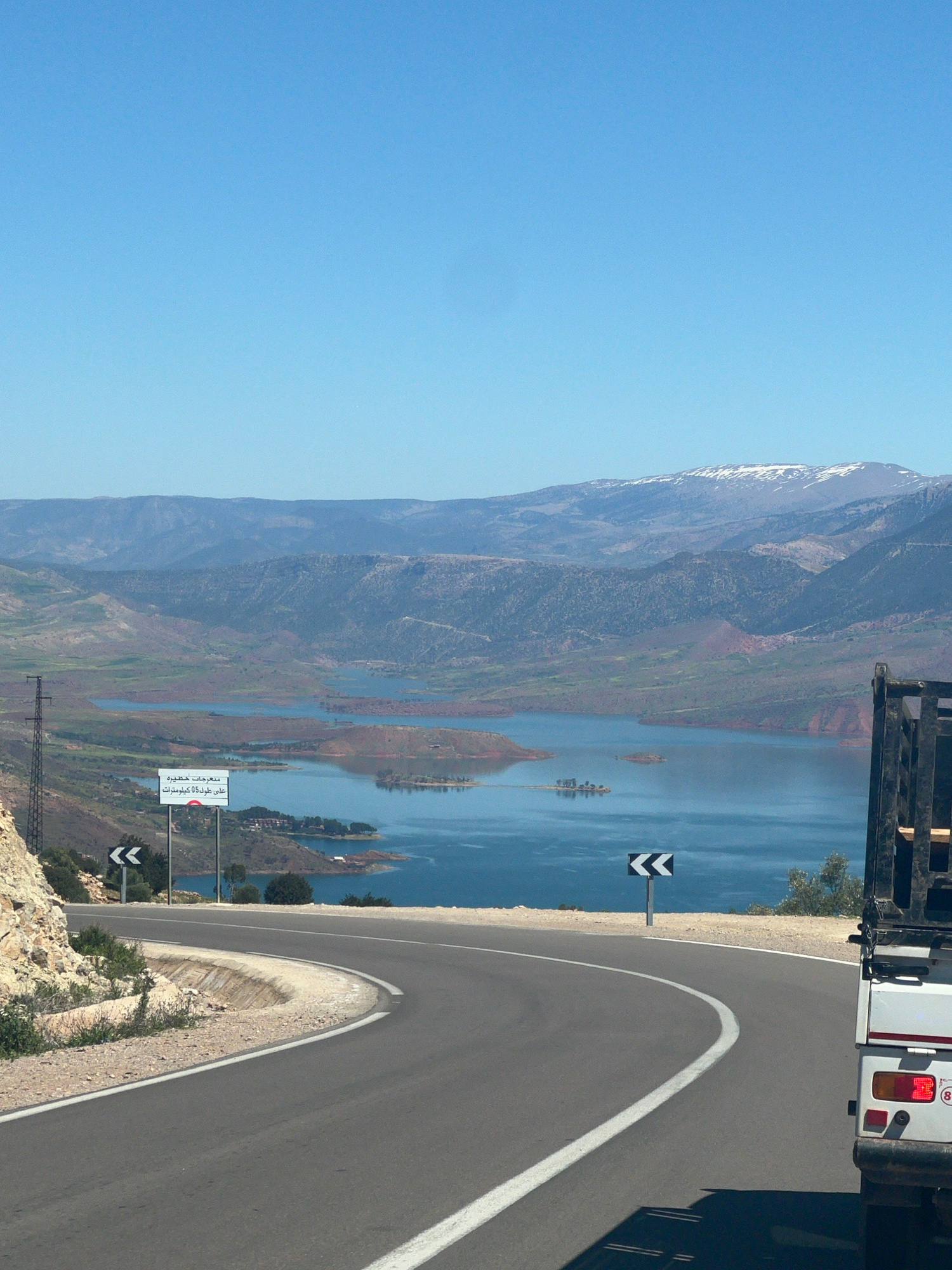 The image presents a scenic view from a roadside location in Bin El Ouidane, Morocco, offering a panorama of a mountainous landscape with a body of water, likely the Bin El Ouidane Lake or reservoir,…read more