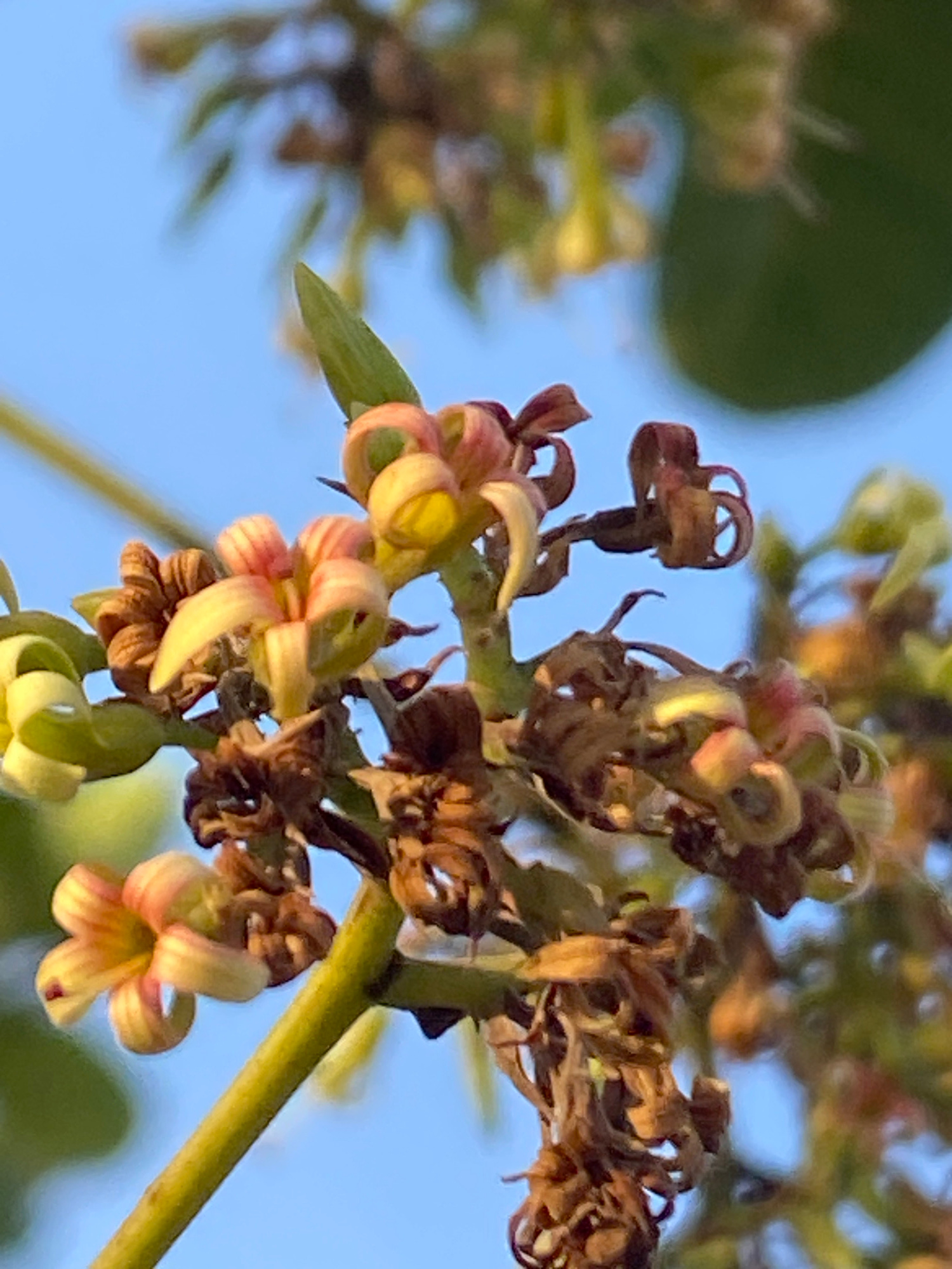 A close-up shot shows the blossoms of a cashew tree (Anacardium occidentale) in Achara, Nigeria. The flowers are clustered along a green stem. Some are in bloom, showing light yellow petals with faint…read more