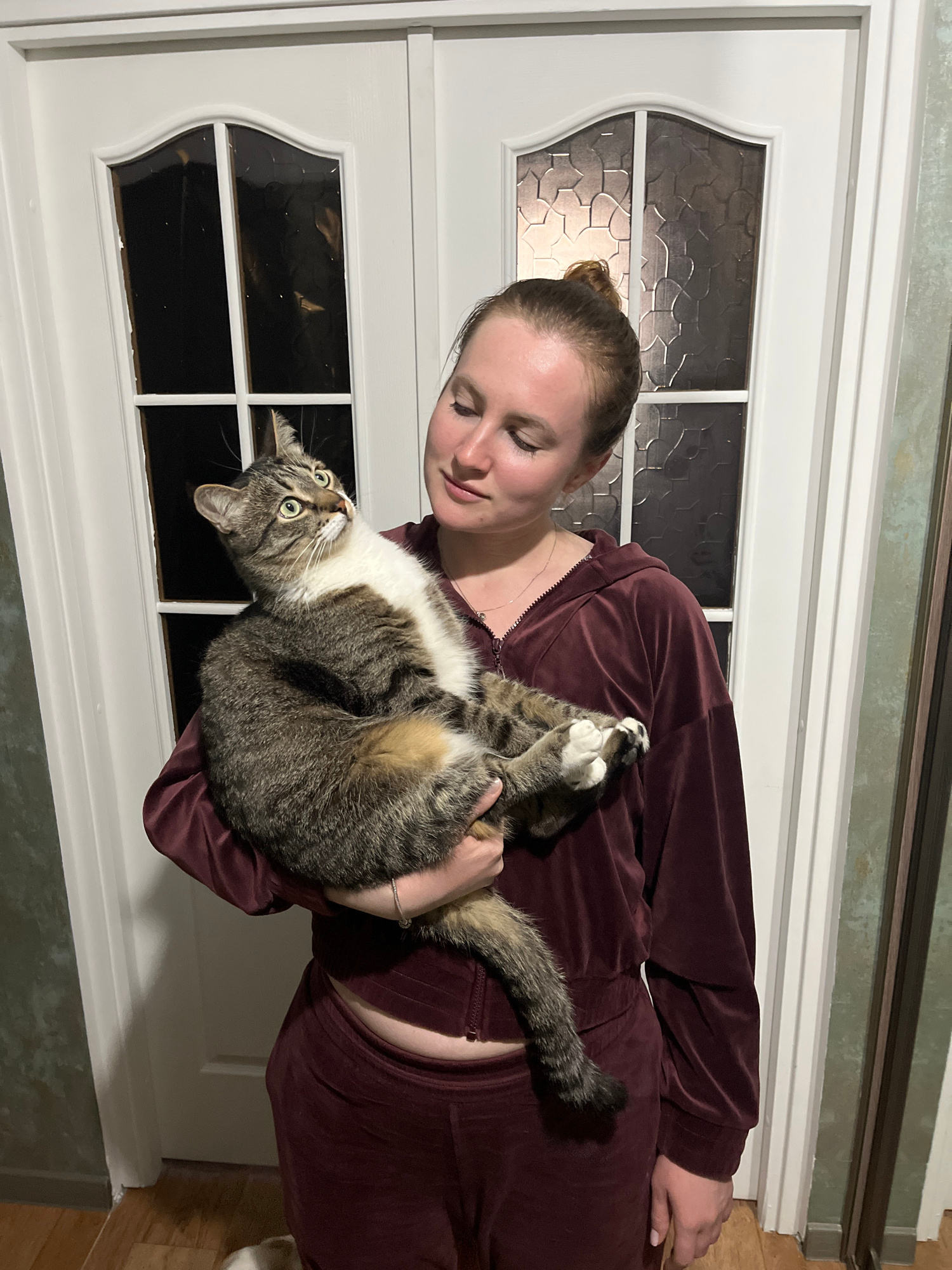 A woman with her hair in a bun is holding a tabby cat in front of a white door with glass panels. The woman is wearing a dark burgundy tracksuit. The cat is looking to the left with its eyes open. The…read more