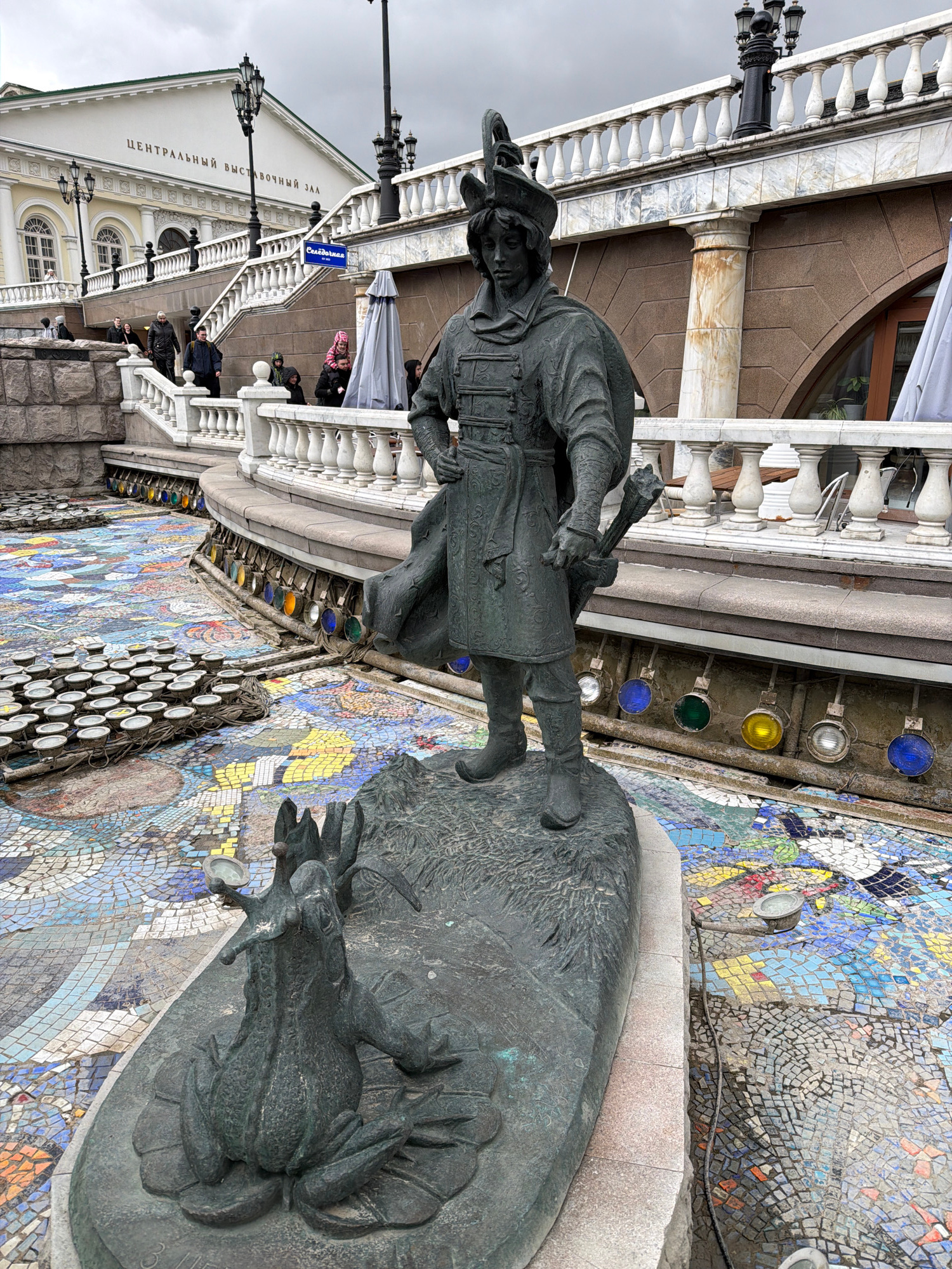 The image captures a scene in Moscow, Russia, featuring a bronze statue of a man standing over a lizard-like creature, likely a depiction of a character from Russian folklore. The statue is placed aga…read more