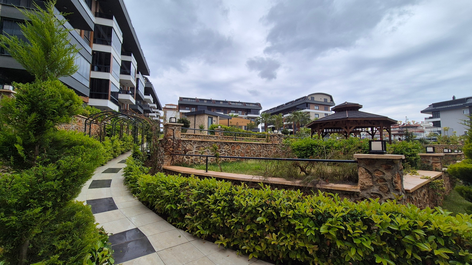 The image depicts a residential area in Alanya, Turkey, under a cloudy sky. The scene includes apartment buildings with modern architecture, featuring balconies and dark gray trim. A landscaped garden…read more