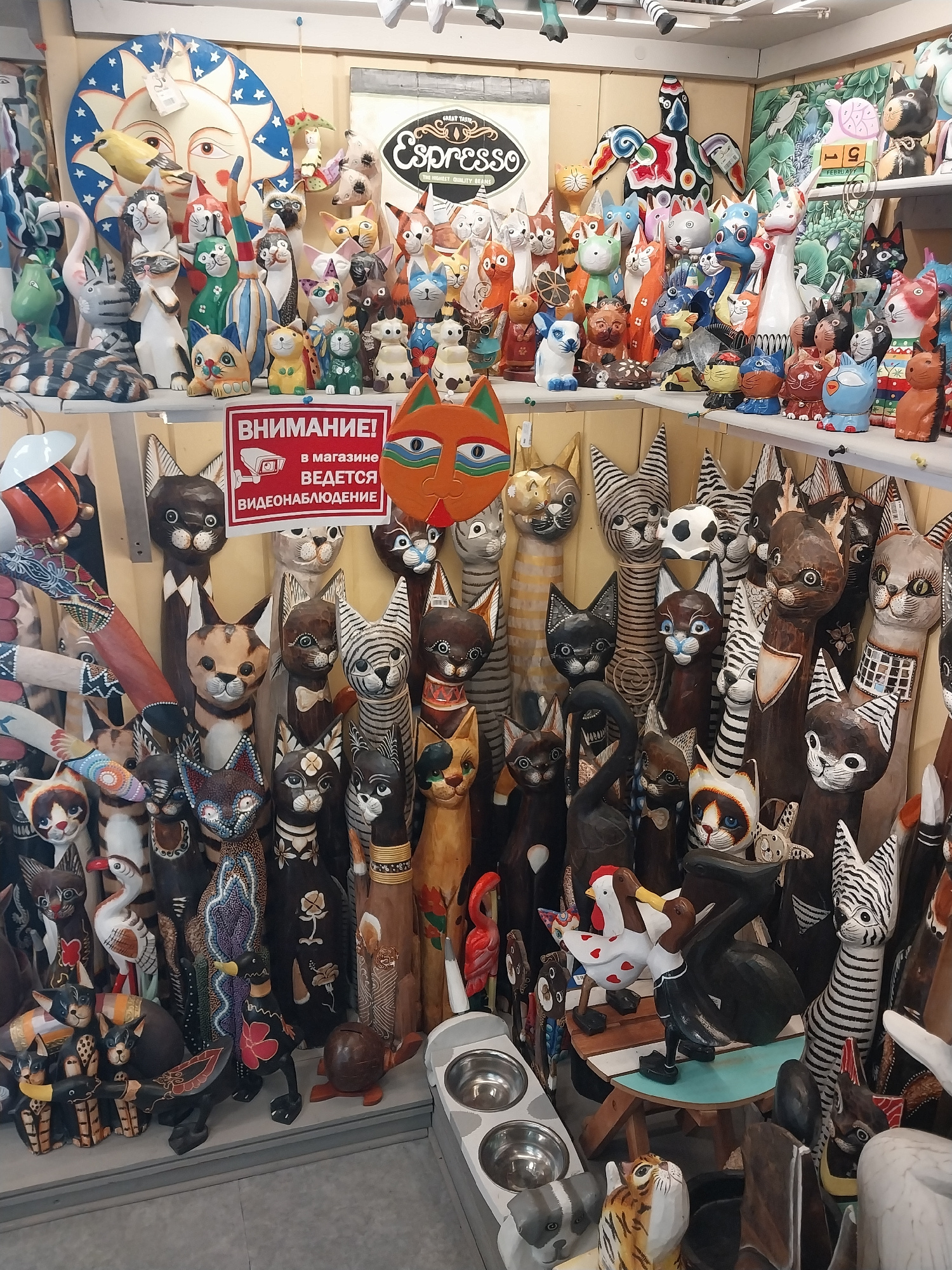 The image displays a vibrant and densely packed collection of handcrafted wooden animal figures, primarily stylized cats, in what appears to be a retail store or market stall in Sochi, Russia. The sce…read more