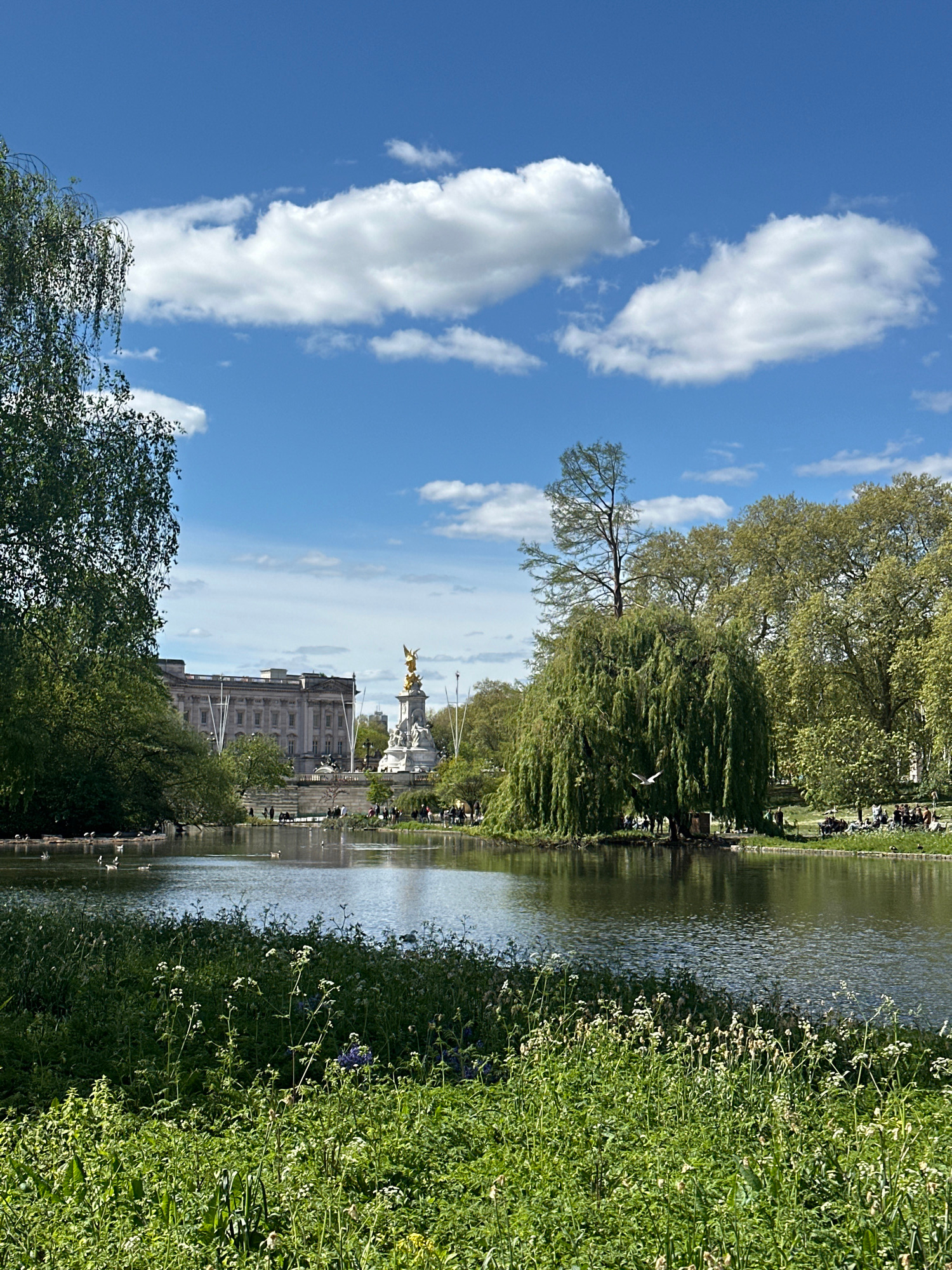 This image shows a view of Buckingham Palace in London, United Kingdom, across a body of water, likely St. James's Park Lake. The Palace, a large building with a statue on top, is partially obscured b…read more