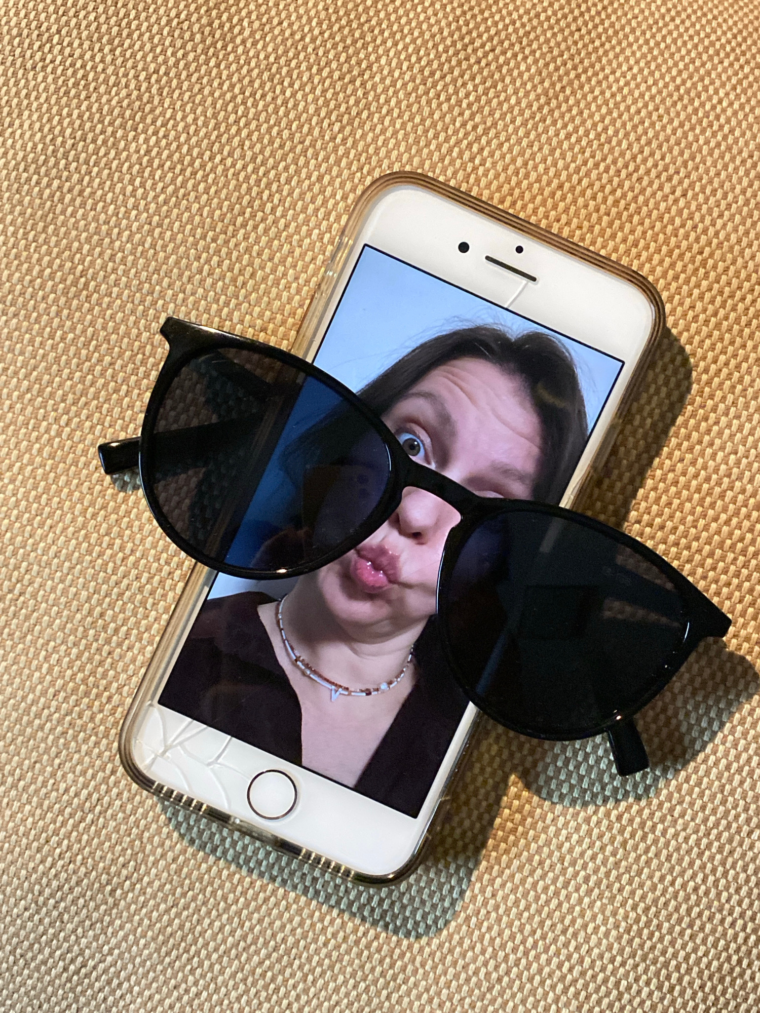 The image shows a white smartphone lying on a textured tan surface. The screen displays a selfie of a person with pursed lips wearing a necklace. Black sunglasses are placed diagonally across the phon…read more