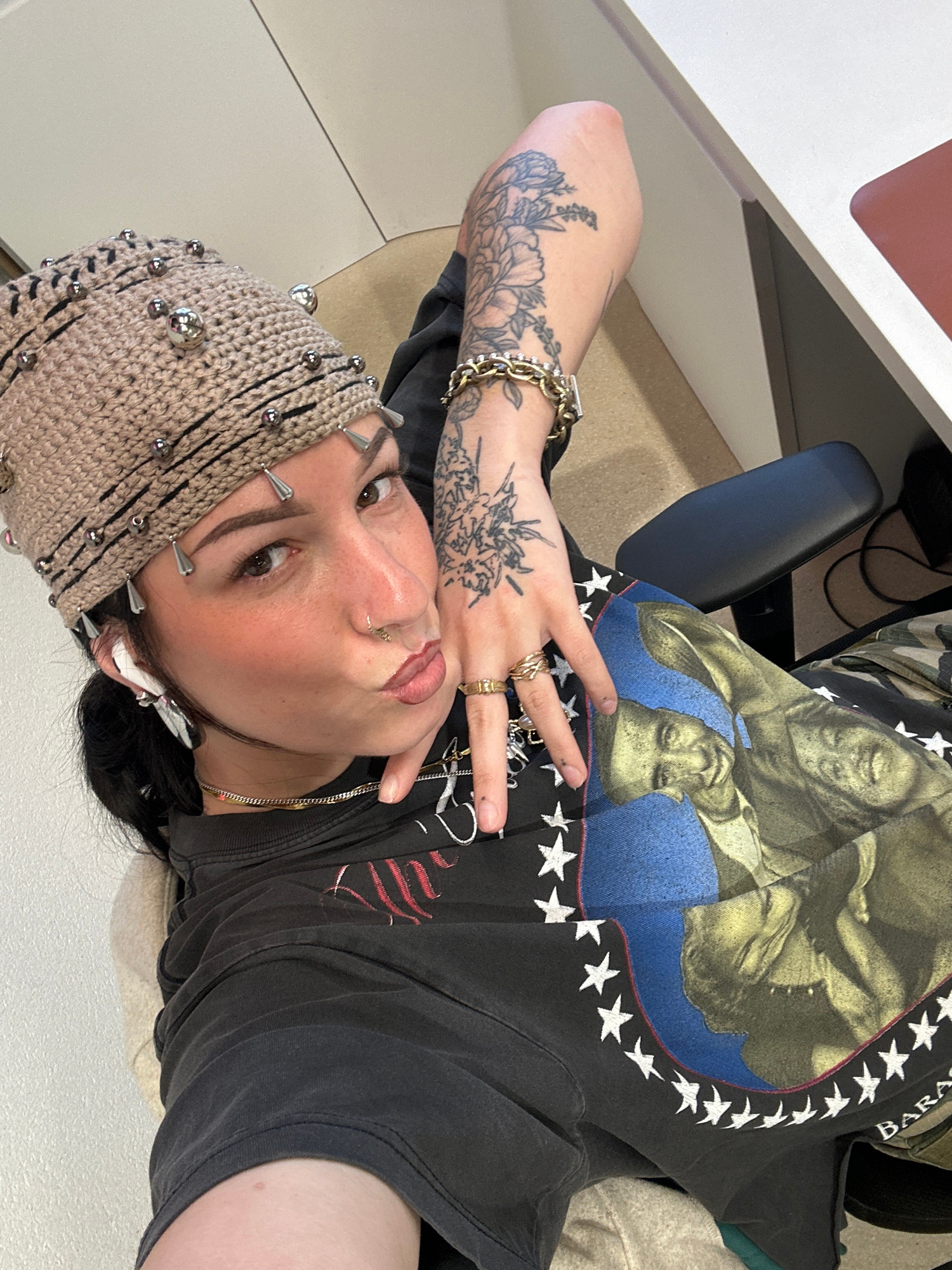 A person wearing a studded crocheted hat is captured in a medium shot. The individual has facial piercings, visible tattoos on their arm, and multiple rings on their fingers. They are wearing a blackβ¦read more