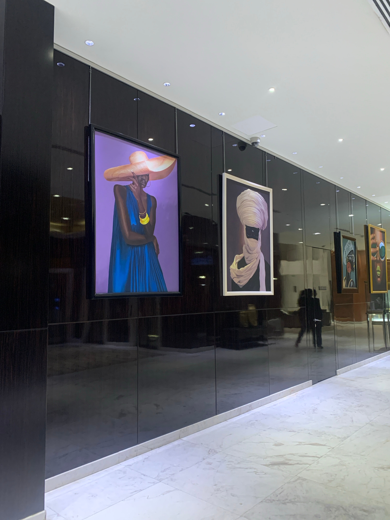 The photograph shows a corridor with artwork displayed on a dark-paneled wall. The floor is made of light-colored marble tiles. There are several framed artworks on the wall, including a portrait of a…read more