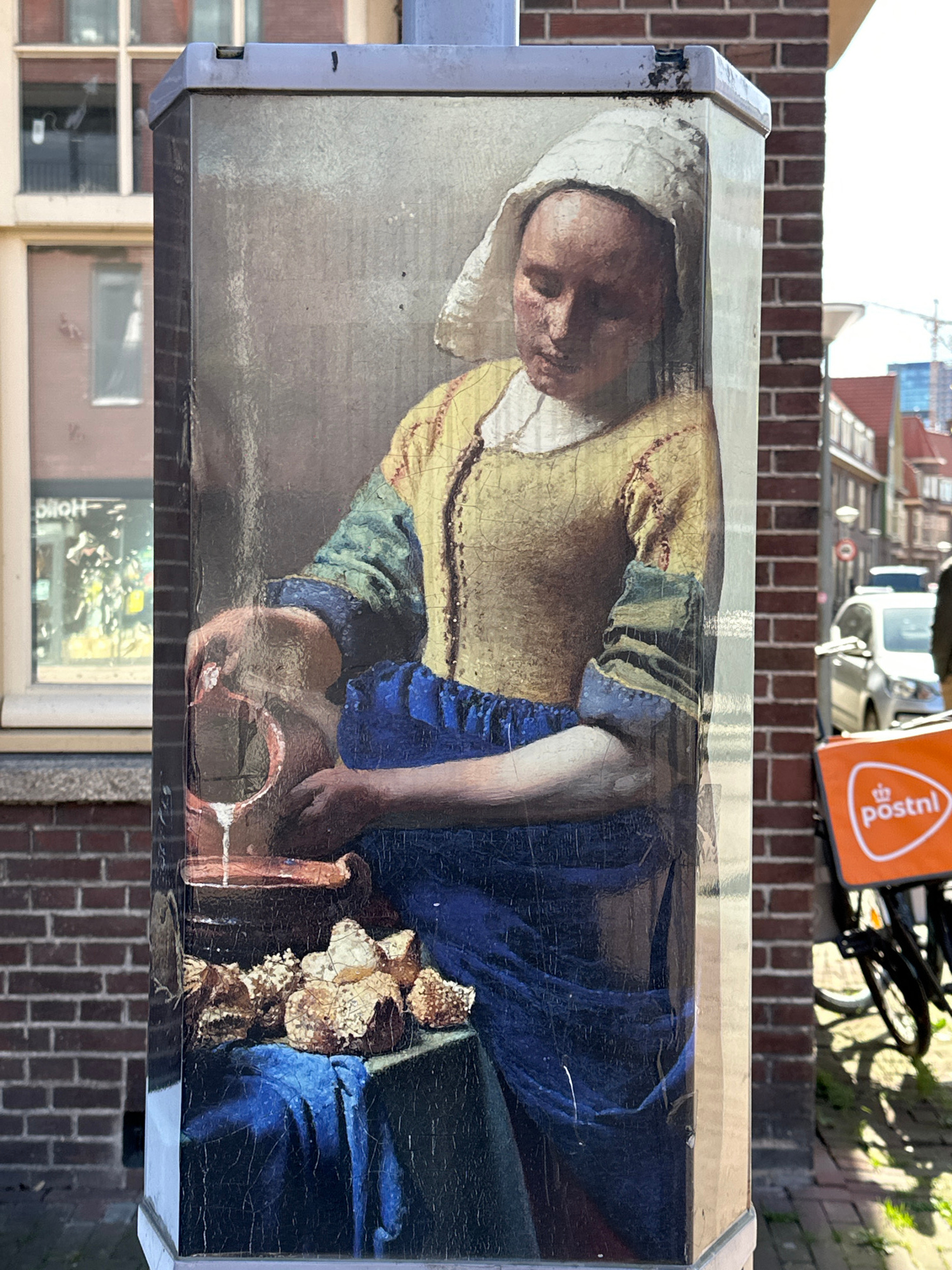 The image depicts a rectangular, metallic utility box displaying a reproduction of Johannes Vermeer's painting "The Milkmaid." The box is positioned outdoors, likely on a street corner. The backdrop i…read more