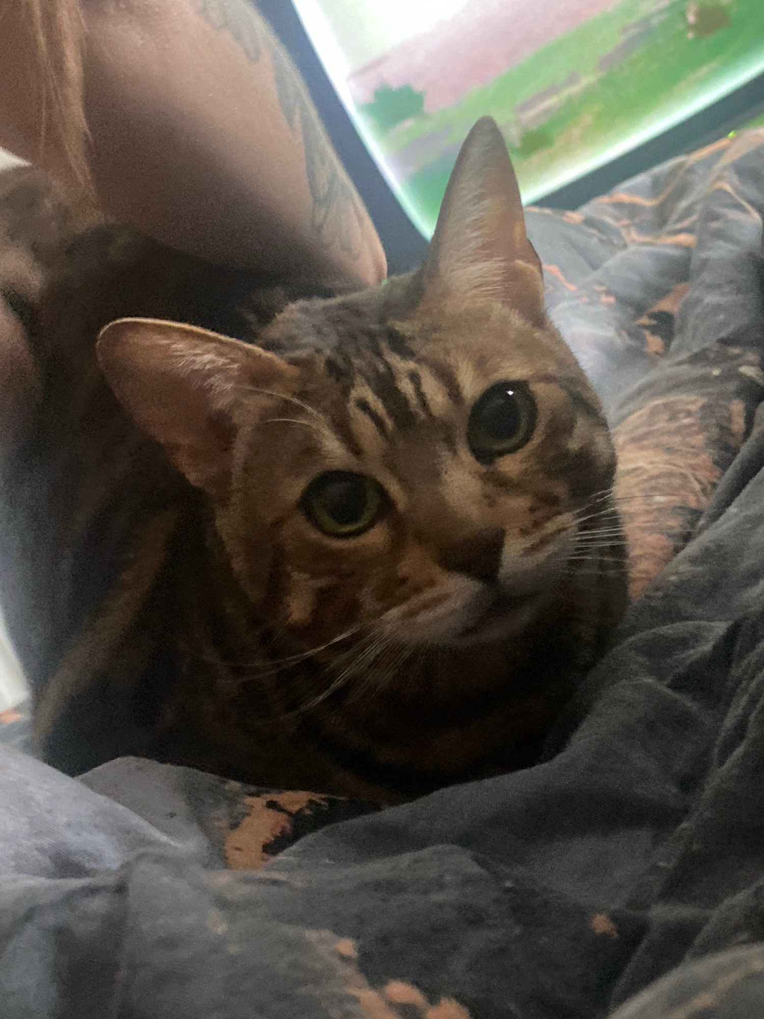 This media features a domestic cat, likely a Bengal or a similar breed, nestled amongst dark grey fabric. The cat, with its distinctive brown and dark-striped/spotted fur, looks directly towards the c…read more