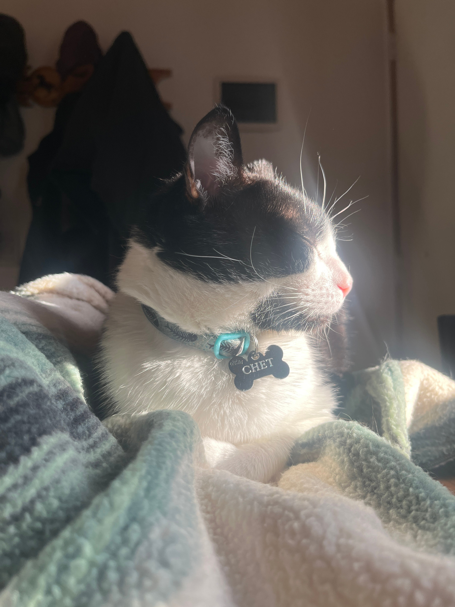 A black and white cat named Chet is captured in a close-up, brightly lit image, appearing to be deeply relaxed or asleep. The cat is positioned on its side, with its head tilted upwards, basking in a…read more