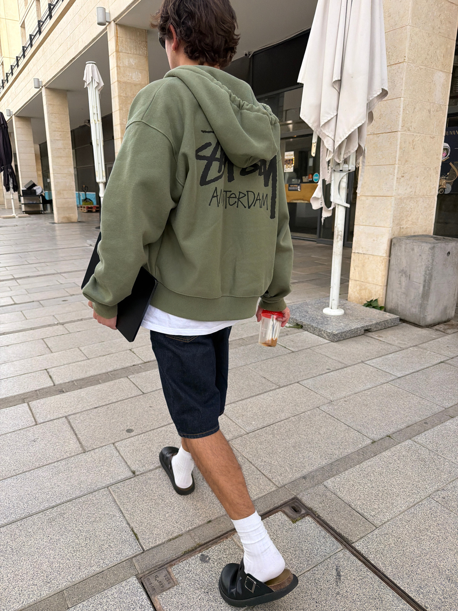 A person wearing a green hoodie, dark shorts, and socks with sandals is walking on a paved sidewalk. The hoodie has "Amsterdam" printed on the back. The person is holding a container with a red lid in…read more