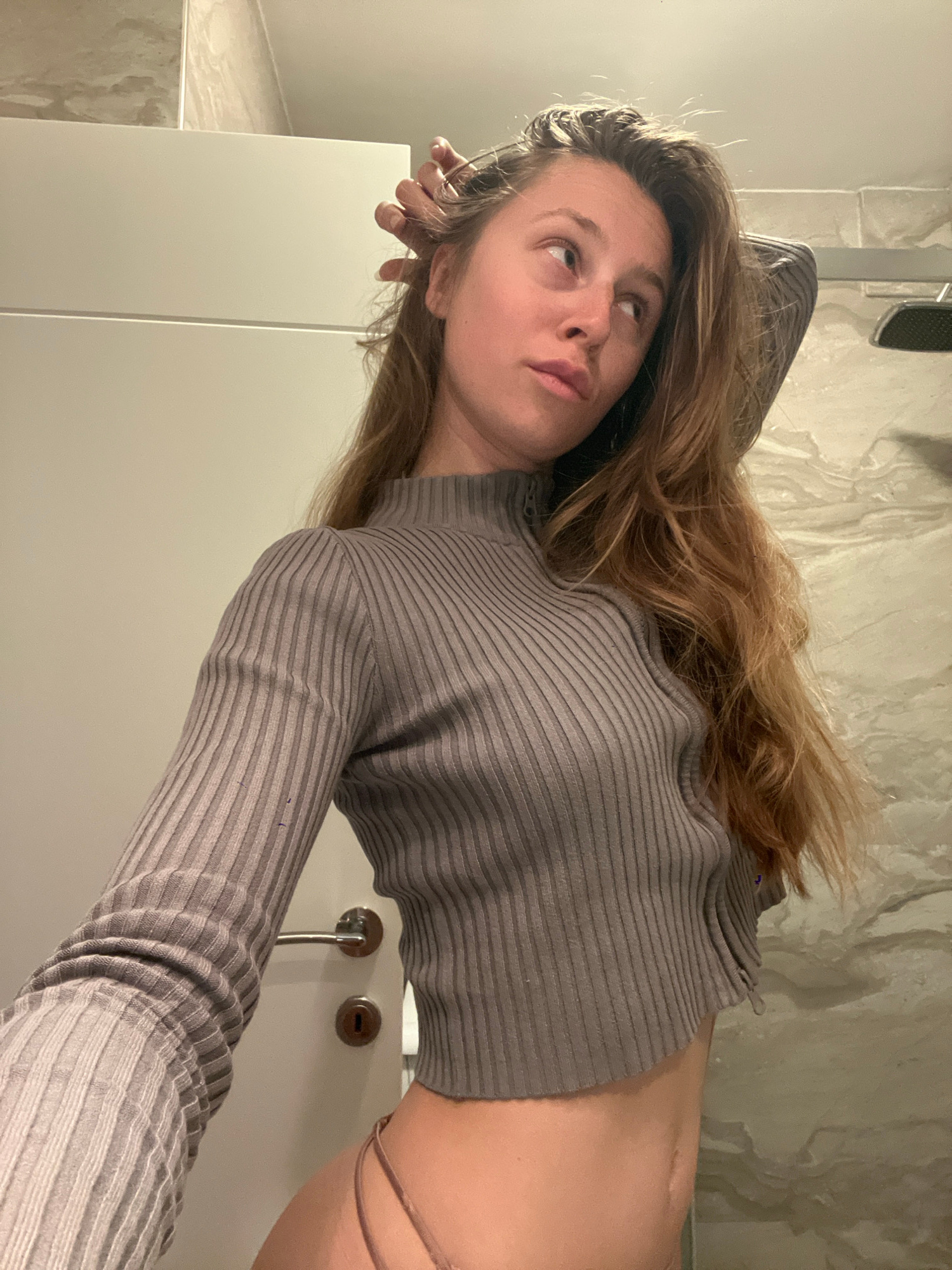 A young woman stands indoors, in what appears to be a bathroom. She wears a long-sleeved, ribbed gray shirt and a thin strap of what appears to be underwear is visible near her right hip. Her long bro…read more