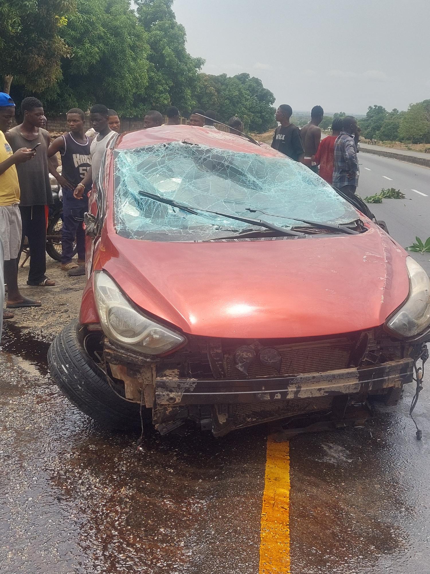 The image depicts a red car severely damaged in a collision, likely on a road in Akwanga, Nigeria. The car's windshield is shattered, and the front end is significantly crumpled. A yellow line marking…read more