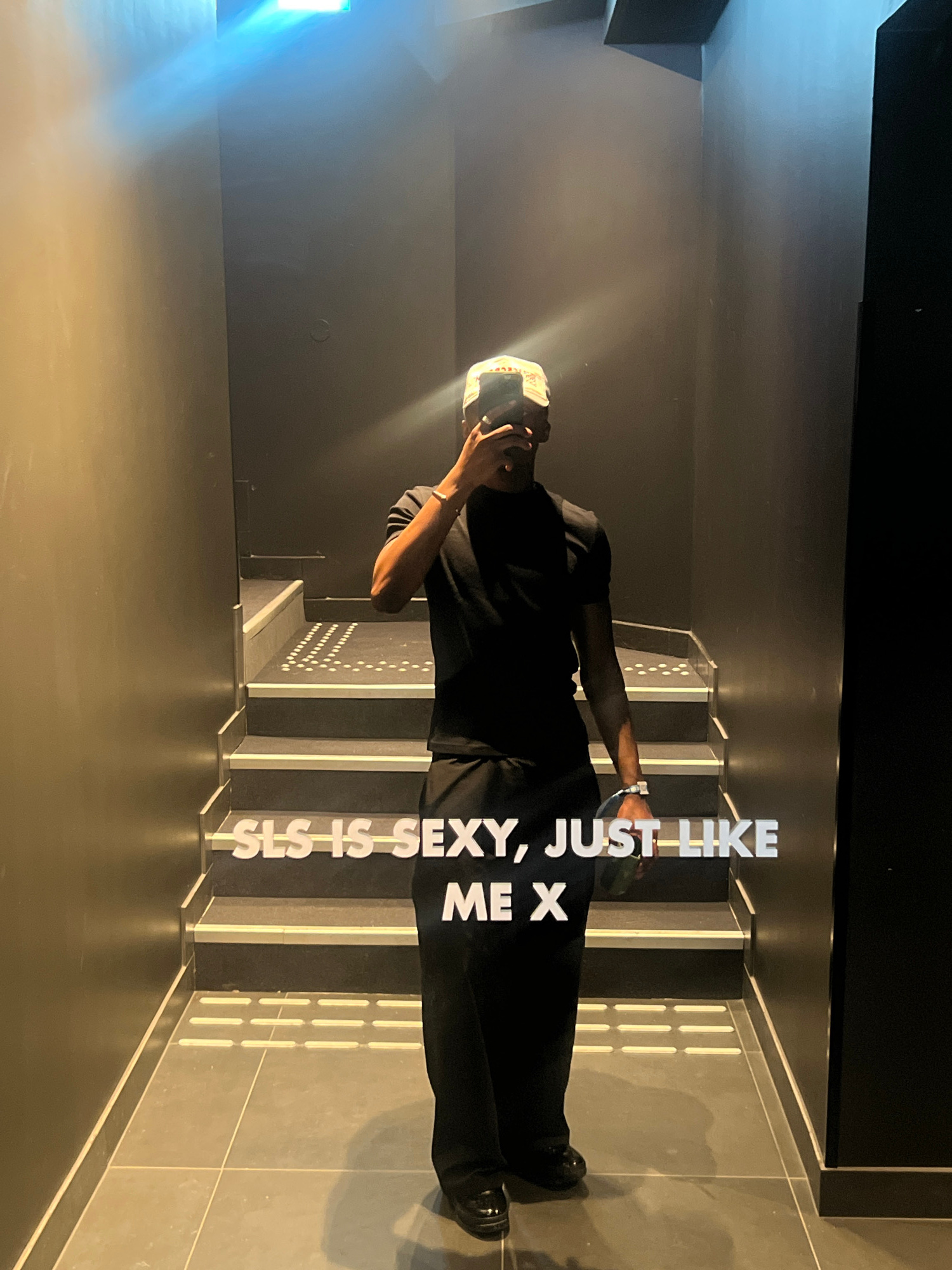 A person in a black outfit stands on a staircase in Hemsedal, Norway. The text "SLS IS SEXY, JUST LIKE ME X" is digitally added to the image. The staircase is primarily dark with light grey steps and…read more