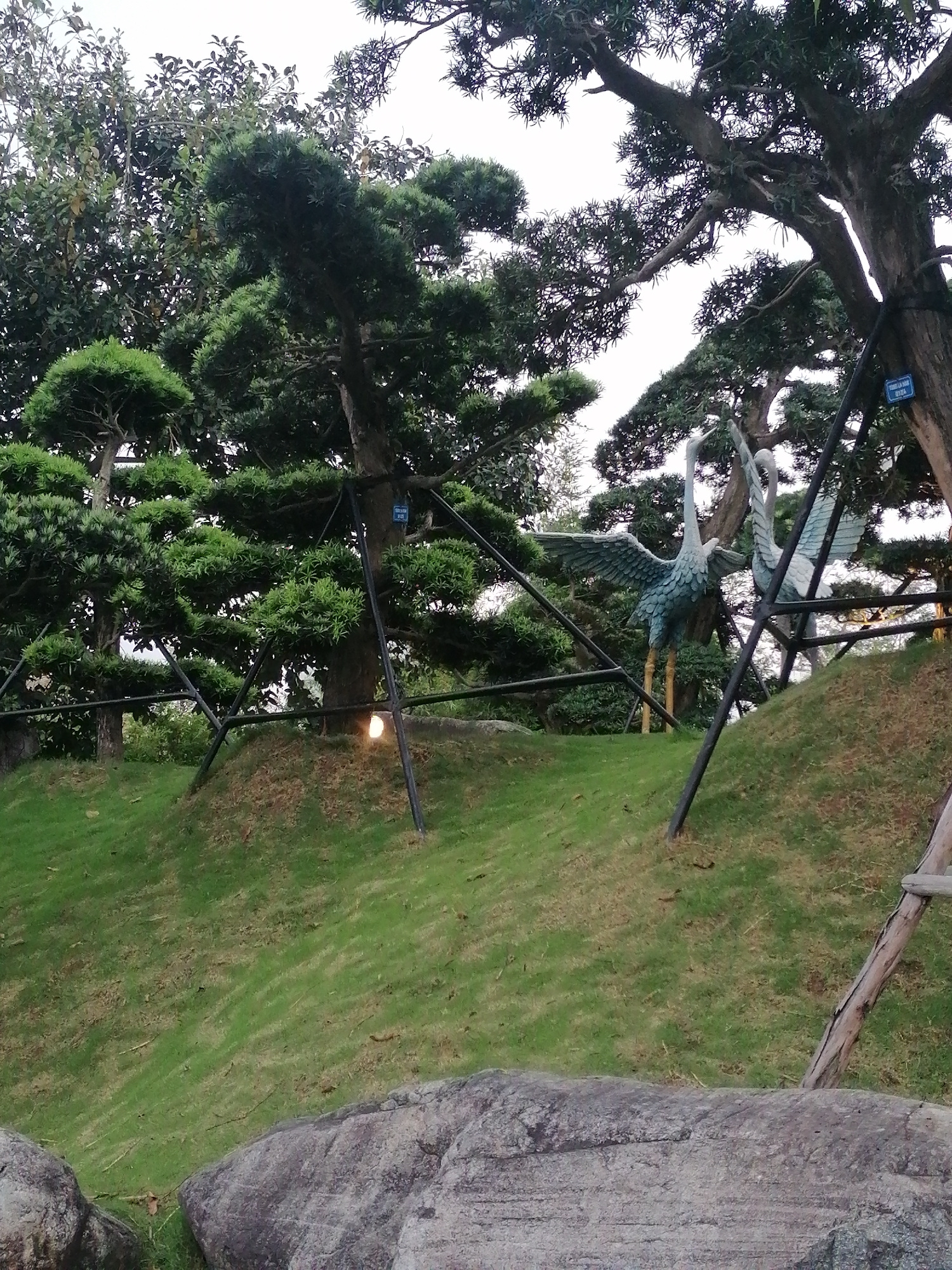 The image captures a landscape within Hong Gai Ward, Vietnam, featuring two crane statues standing on a grassy hill. The statues, appearing to be made of stone or metal, depict cranes with outstretche…read more