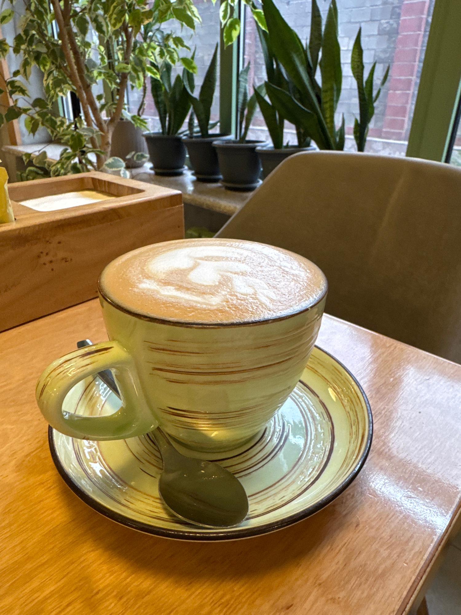 A cup of latte art sits on a saucer with a spoon on a wooden table. A plant is visible to the left of the table, and outside the window is a view of Bishkek City, Kyrgyzstan. The scene is indoors.