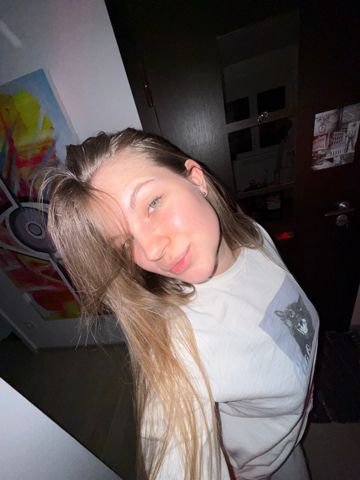 The scene depicts an indoor environment located in the city of Vozdovac Urban Municipality, Serbia. A female subject, identified by her light skin, long light-brown hair, and green eyes, is positioned…read more