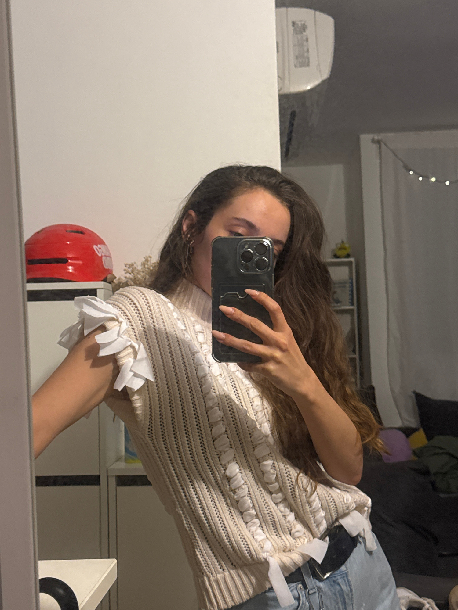 A person stands in front of a mirror, holding a smartphone in their right hand to take a selfie. The phone obscures most of the person's face except for the eyes, eyebrows, and part of the nose. The p…read more