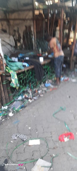 A person is lying motionless amidst debris and scrap materials. The individual, wearing dark pants, is positioned next to what appears to be a makeshift wooden structure. Scattered around are green ri…read more