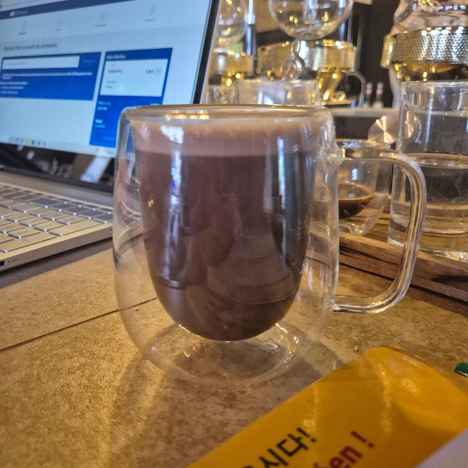 The image shows a glass mug filled with a dark liquid, likely coffee or chocolate, sitting on a table near a laptop. A yellow object with Korean writing is visible on the left. In the background, therβ¦read more