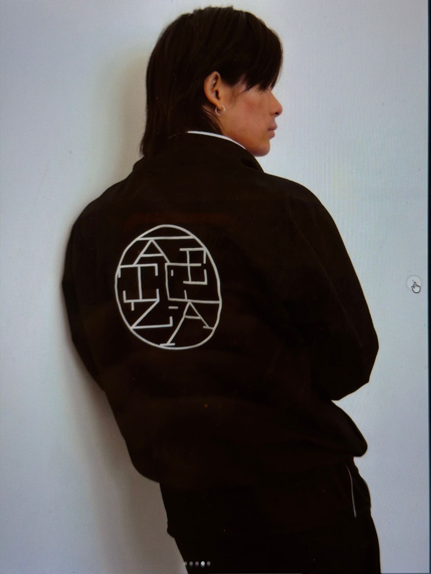 A person with short black hair, wearing a black jacket with a white circular design on the back, lies on a white surface. The design appears to contain the letters "KEN" within the circle. The person…read more