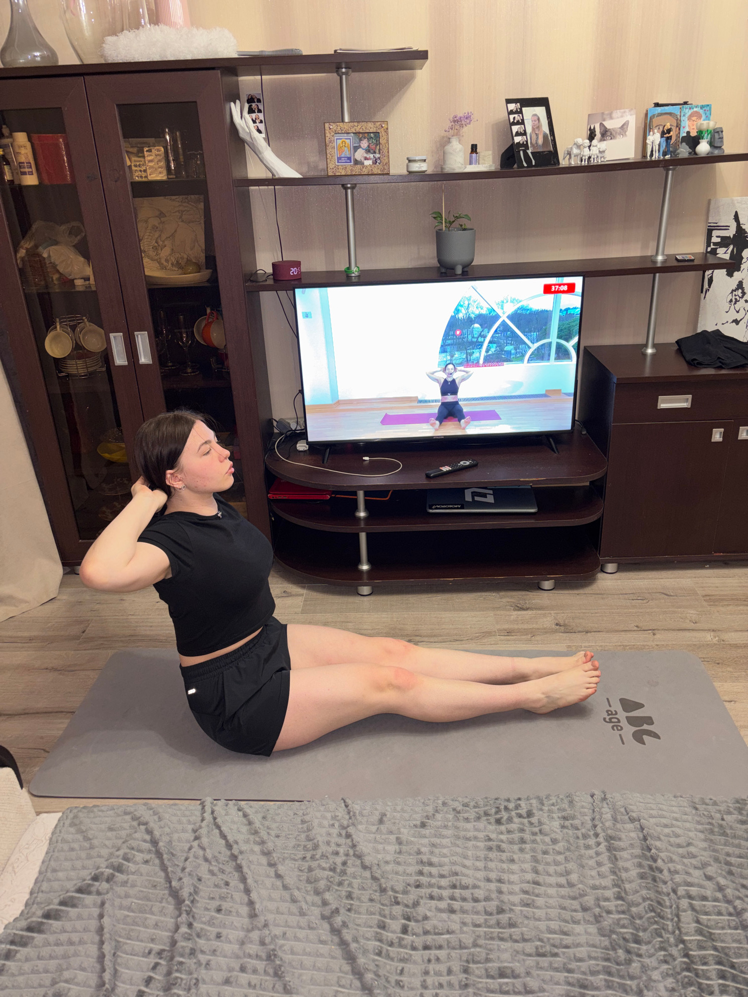 A woman is performing an abdominal exercise on a gray yoga mat in a room with brown furniture. Her legs are raised in the air, and her hands are behind her head. She is watching a video on a televisio…read more