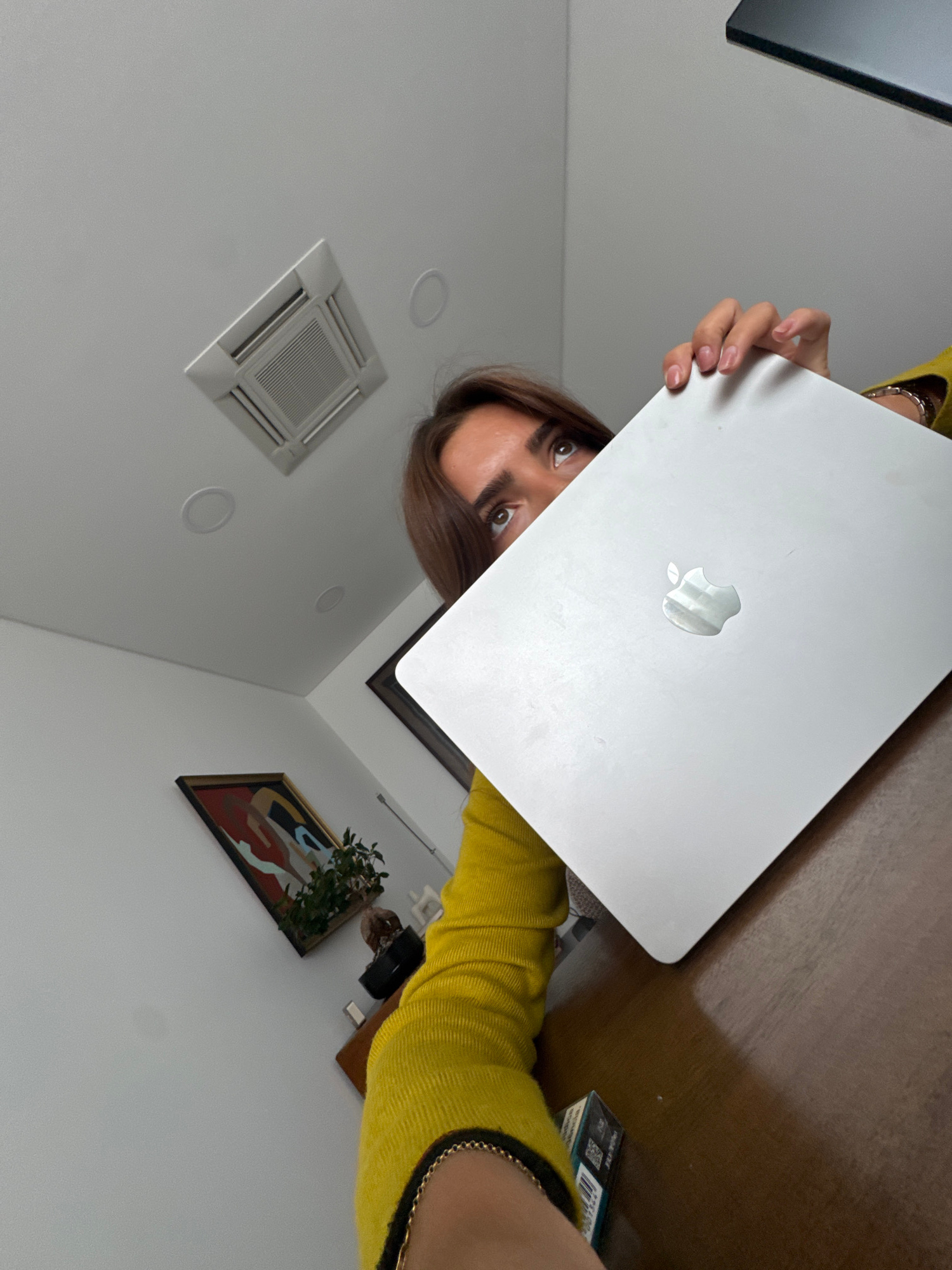 A woman holds a closed silver Macbook laptop in front of her face, obscuring most of her features except for her eyes and some of her hair. She is wearing a yellow top. A portion of a table is visible…read more