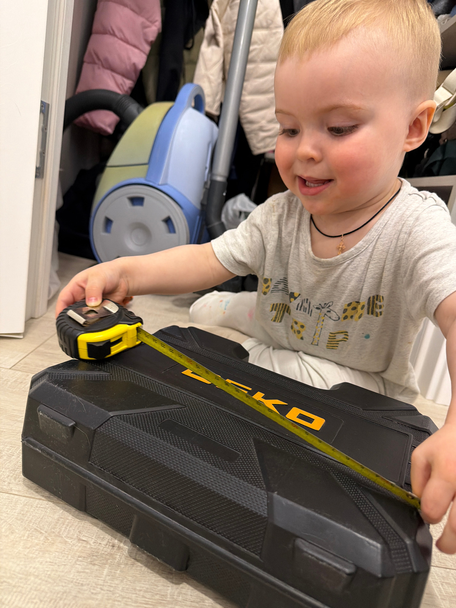 A blonde toddler in a gray t-shirt and white pants measures a black tool case with a yellow tape measure on a wood floor. A blue and yellow vacuum cleaner, clothing, and shelves are visible in the bac…read more