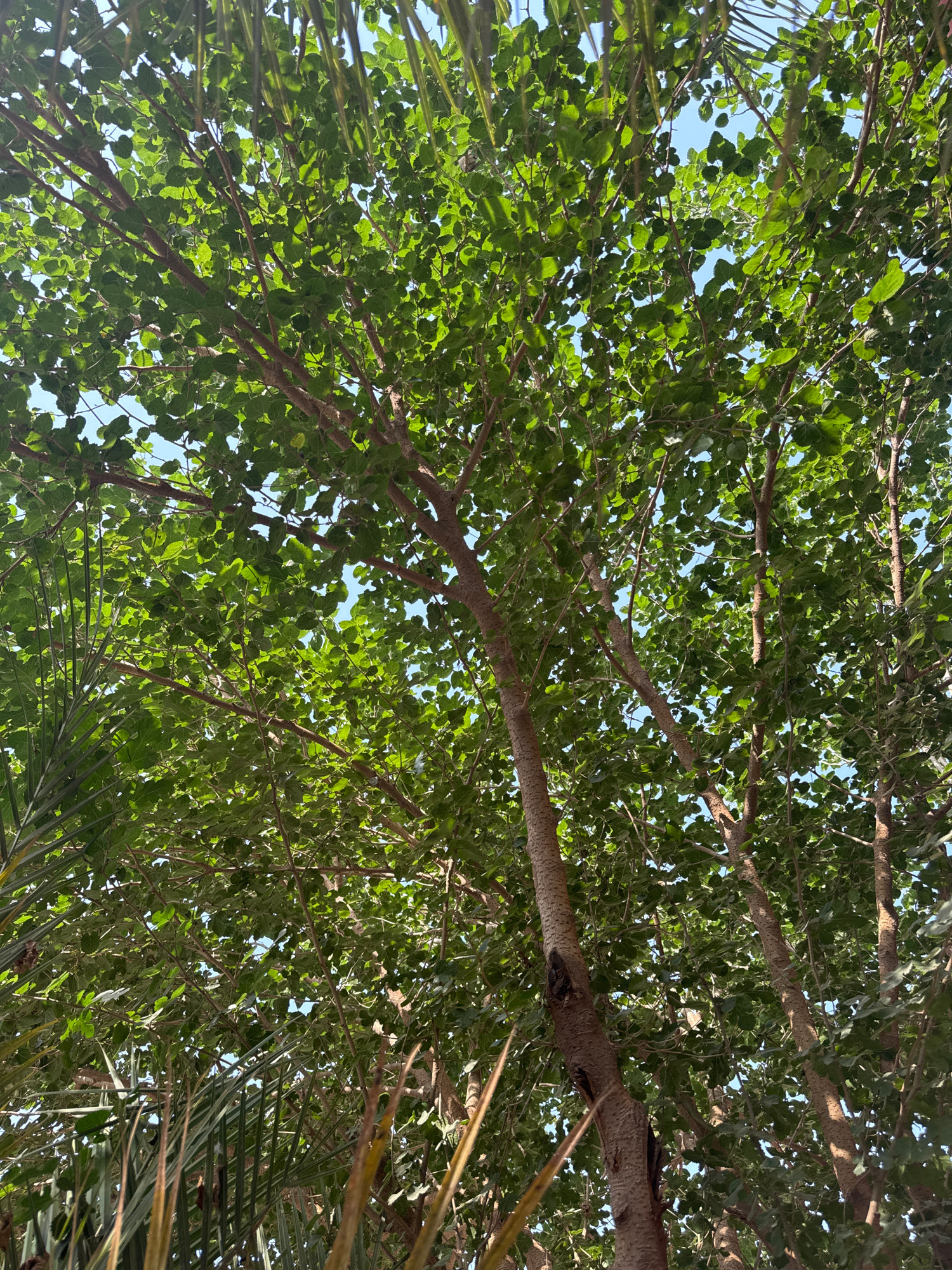 The image shows a view looking up into the canopy of trees in what is likely a public park or green space, probably in Multan, Pakistan. The foliage is dense, with small, round green leaves. The branc…read more