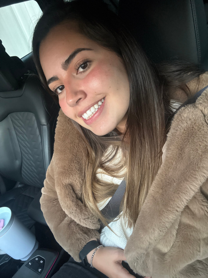 A woman smiles, angled to the left, wearing a fluffy, light brown coat over a white sweater, with a seatbelt across her torso. Her long brown hair falls around her face and shoulders. The interior of…read more