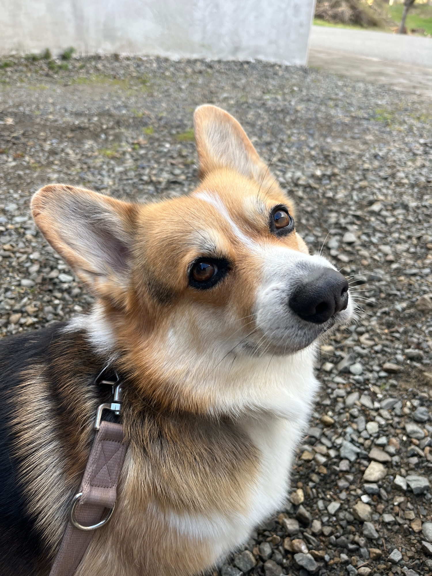 A tri-color Pembroke Welsh Corgi is depicted in a close-up, eye-level portrait. The dog, predominantly brown, black, and white, occupies the lower two-thirds of the frame. Its head is slightly tilted…read more