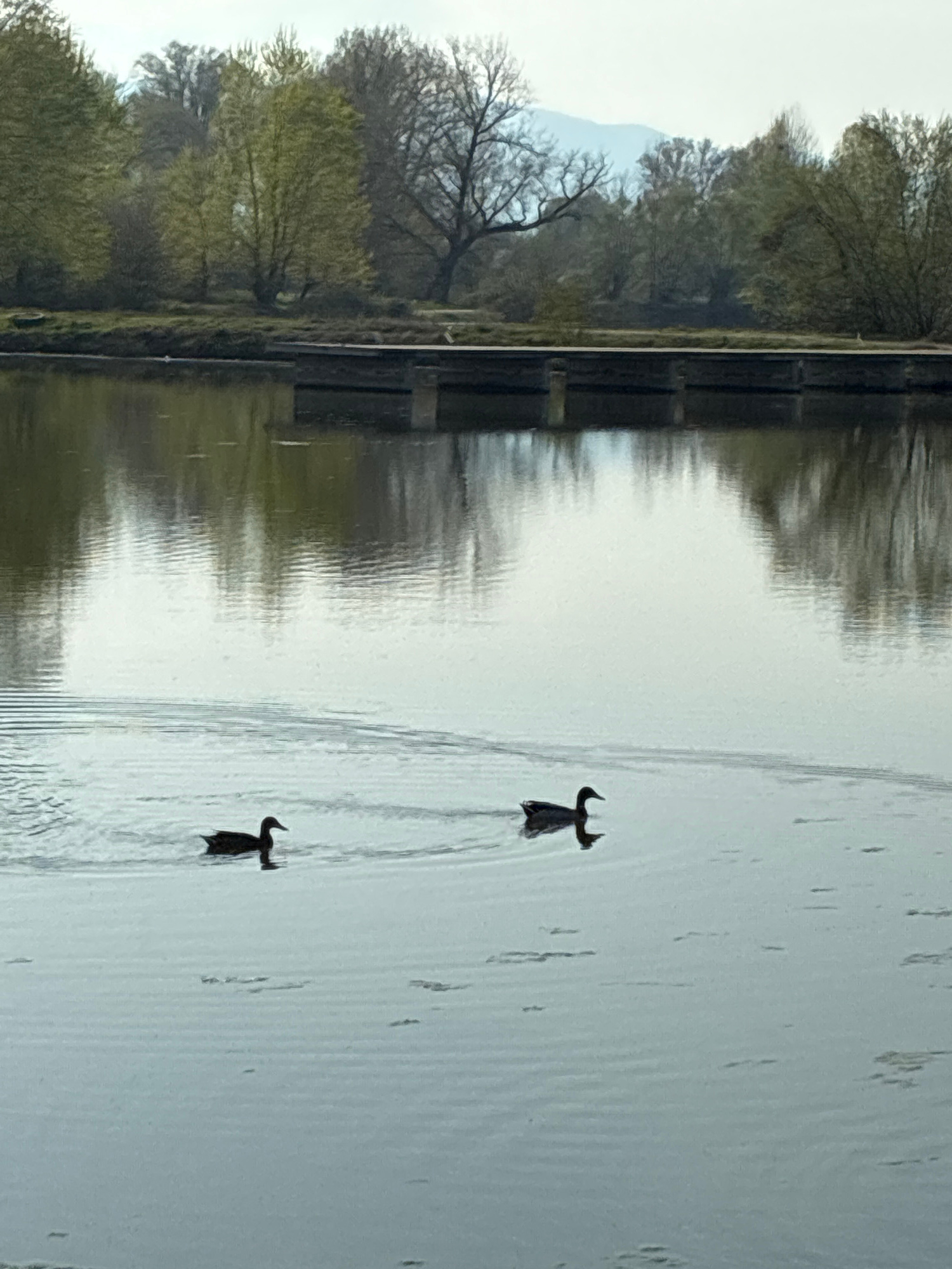 Two diving birds swim in a body of water reflecting trees and a concrete structure. The exact location in Zlokuchene, Bulgaria is not discernible from the image.