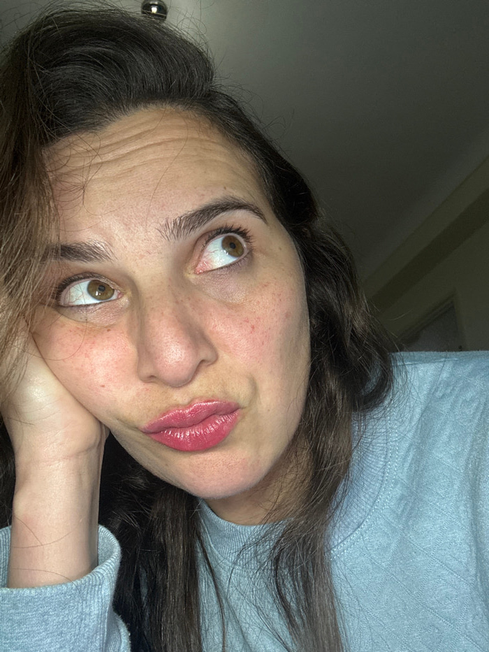 A woman with brown hair and hazel eyes is captured in a close-up, tilted-angle shot. She rests her head on her hand, gazing upward. The woman's skin has freckles, and her lips are coated in a glossy,…read more