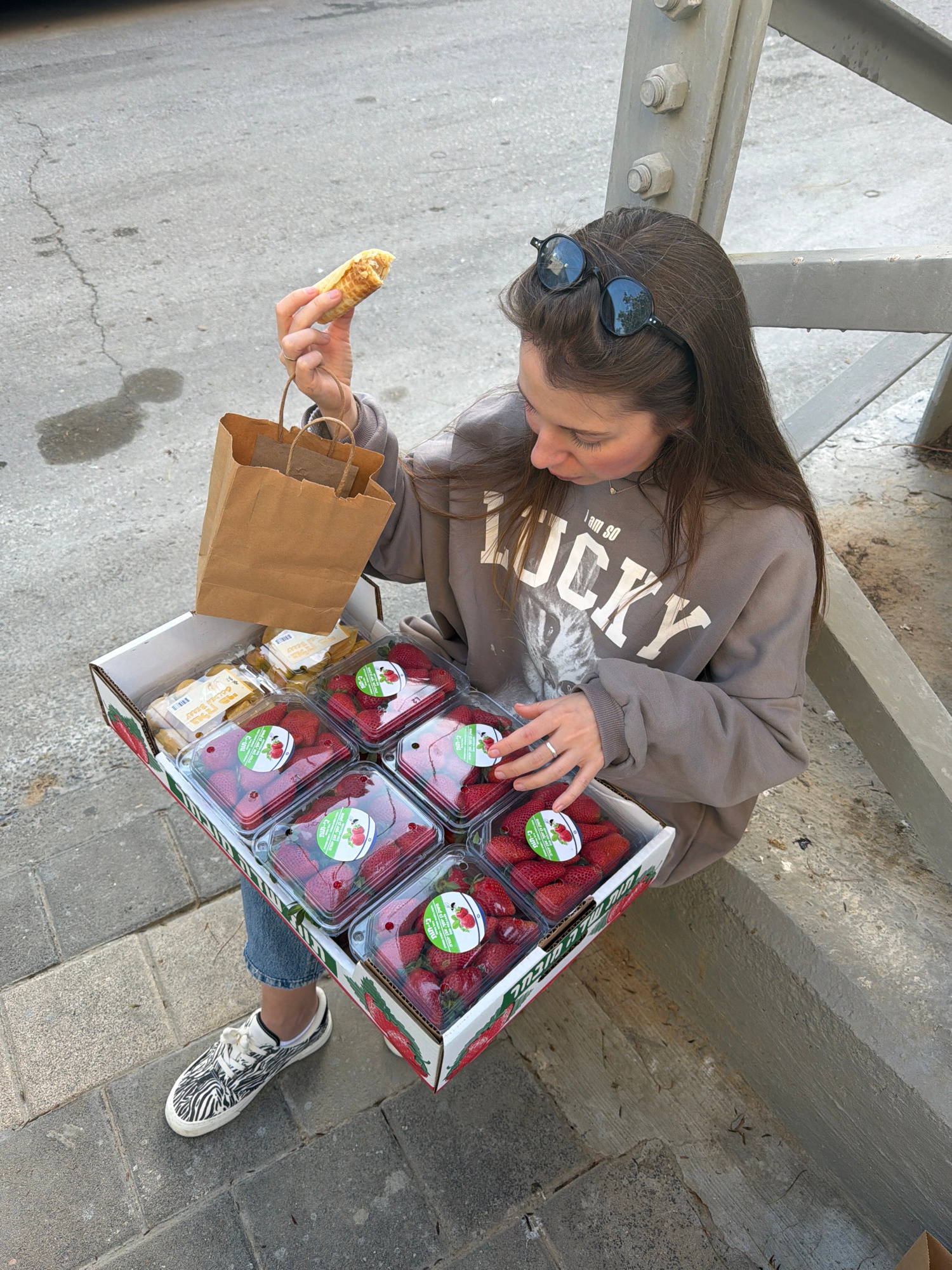 A woman stands on a paved surface in an urban setting, likely the city of Bat Yam, Israel, given the Hebrew writing on the strawberry containers and the fact that Bat Yam is a coastal city. She is hol…read more