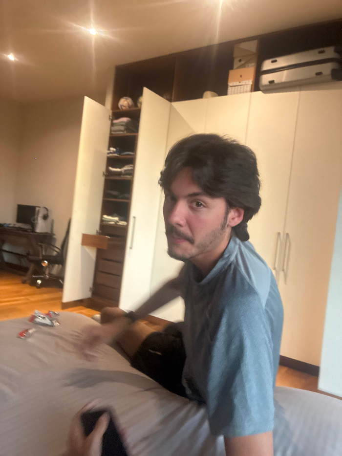 The scene depicts an interior room, likely a bedroom, located in Mexico City, Mexico. One male subject is prominently featured, seated on a light-colored bed, his body turned slightly to his right, and his head gazing directly towards the camera. He possesses dark, medium-length hair, a mustache, and a short beard. He is dressed in a light blue, short-sleeved t-shirt and dark shorts. His right arm is slightly blurred, indicating a recent movement. In the lower left foreground, a human hand holds a dark smartphone, suggesting the perspective of the photographer. On the bed to the left of the male subject, several small white objects with red accents are visible. The background reveals a residential setting. To the far left, a wooden desk is furnished with a desktop computer system, including a monitor, keyboard, and a tower, along with a pair of headphones. A black office chair with wheels sits in front of the desk. The floor throughout this area is hardwood. To the right of the desk and behind the male subject, a large, built-in white wardrobe system extends across the wall. One section on the left side of the wardrobe is open, revealing multiple shelves filled with neatly folded clothing and at least one spherical object, possibly a ball. Another open section further right displays dark wooden drawers. On the top shelf of the wardrobe system, various items including boxes and two silver hard-shell suitcases are stored. The room features light-colored walls and multiple overhead light fixtures, one of which exhibits a prominent lens flare on the ceiling. | Open Wire