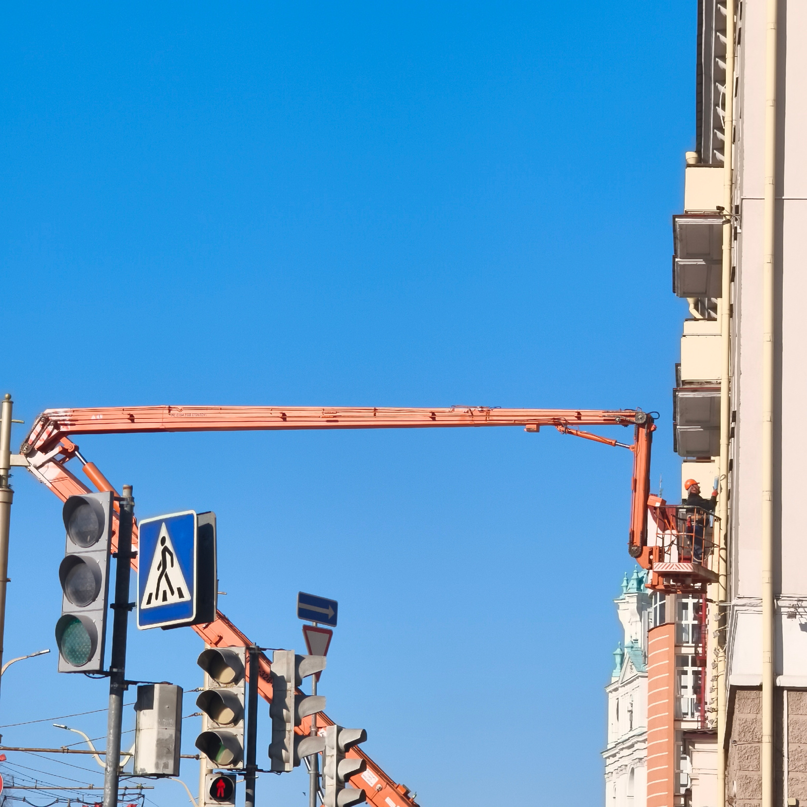 An urban scene shows a man working on the exterior of a building in what appears to be Hrodna, Belarus. The man, wearing a safety helmet, is standing in a bucket lift that is extended to the side of t…read more