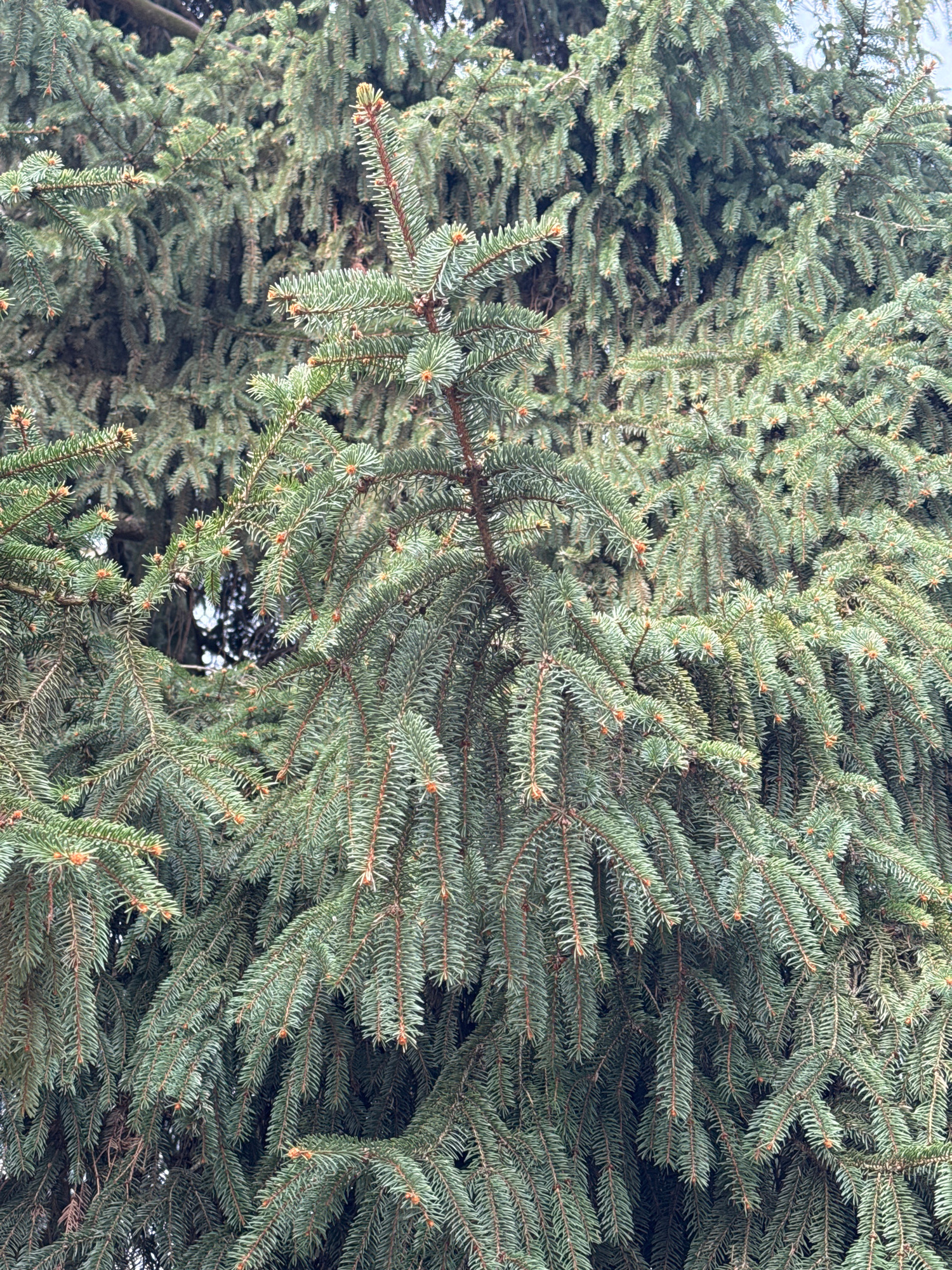 The image shows a close-up of an evergreen tree, specifically a spruce or fir. The needles are dense and blue-green. The location is not discernible from the image, and there is no information to sugg…read more
