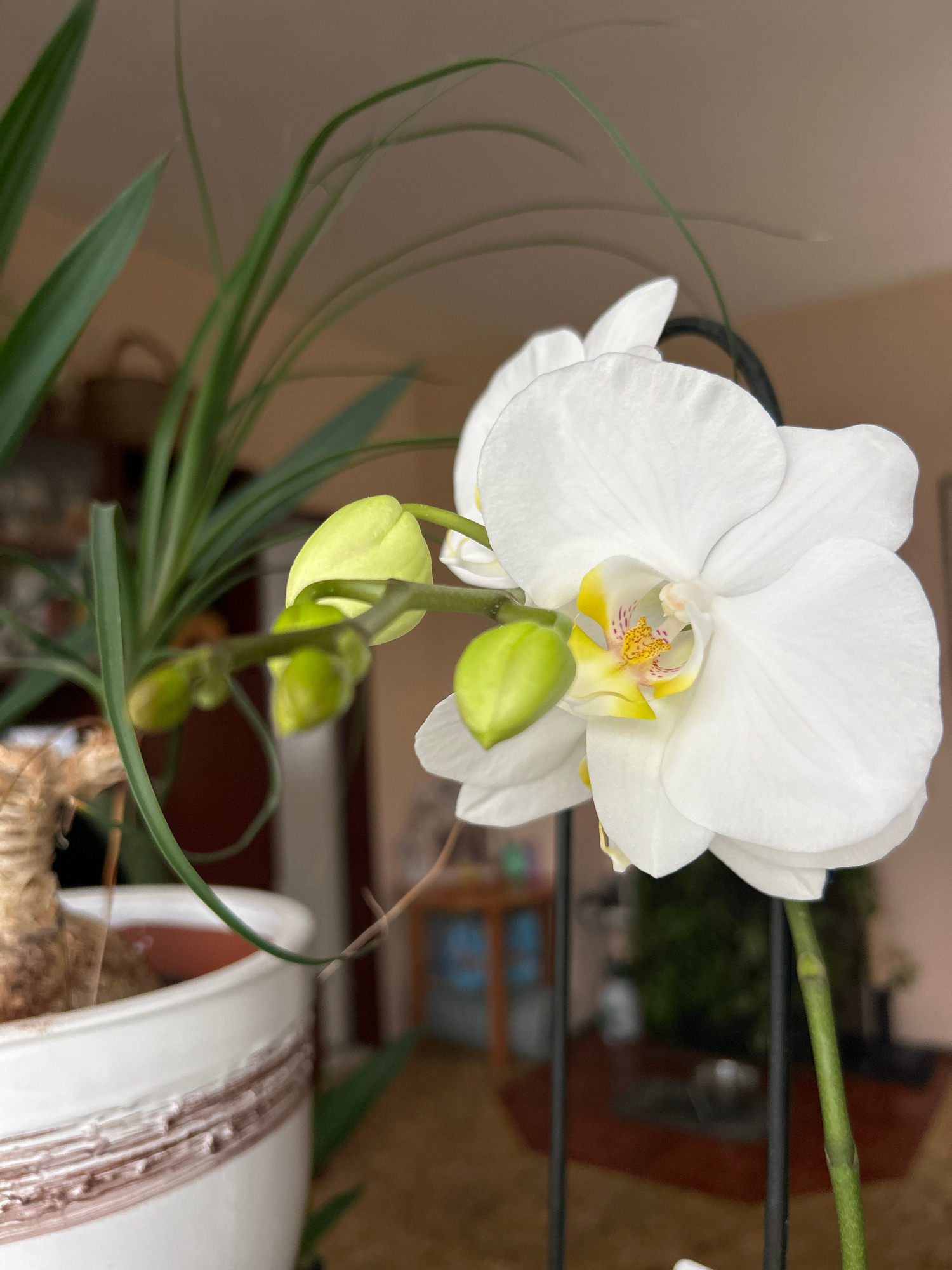 A close-up, slightly tilted, eye-level shot depicts a white orchid flower with several unopened buds. The orchid is potted in a white ceramic pot with decorative brown streaks. The pot is filled withβ¦read more
