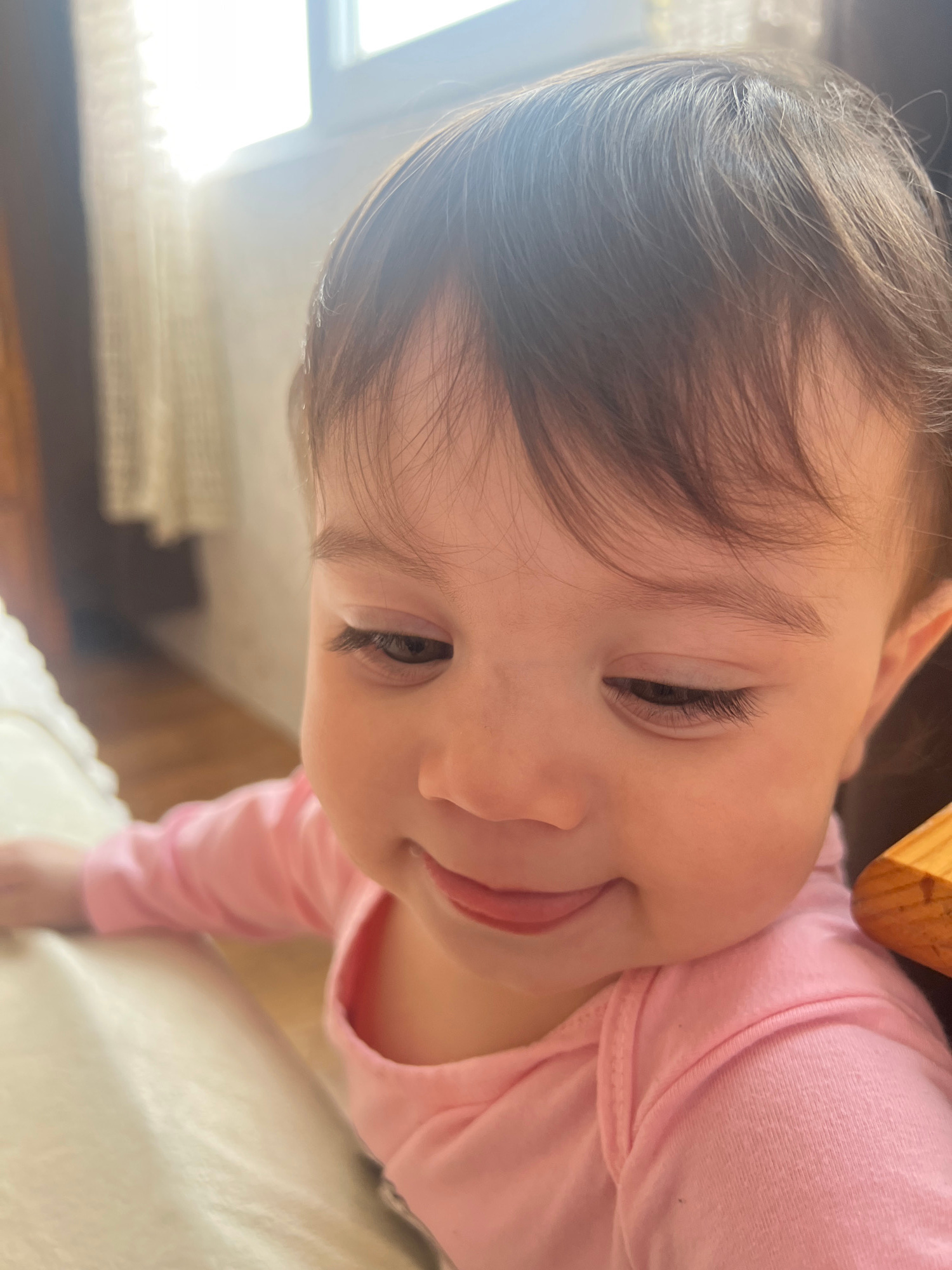 A close-up, slightly tilted, portrait of a baby girl with fair skin, brown hair, and brown eyes. She is wearing a pink long-sleeved onesie. She has a slight smile and her gaze is directed downwards. The background consists of a light-colored, possibly white, surface with some texture, and hints of a window with light filtering through. A wooden element is visible in the upper right corner. The location is unknown and cannot be determined to be Elena, Bulgaria from the visual information provided. | Open Wire