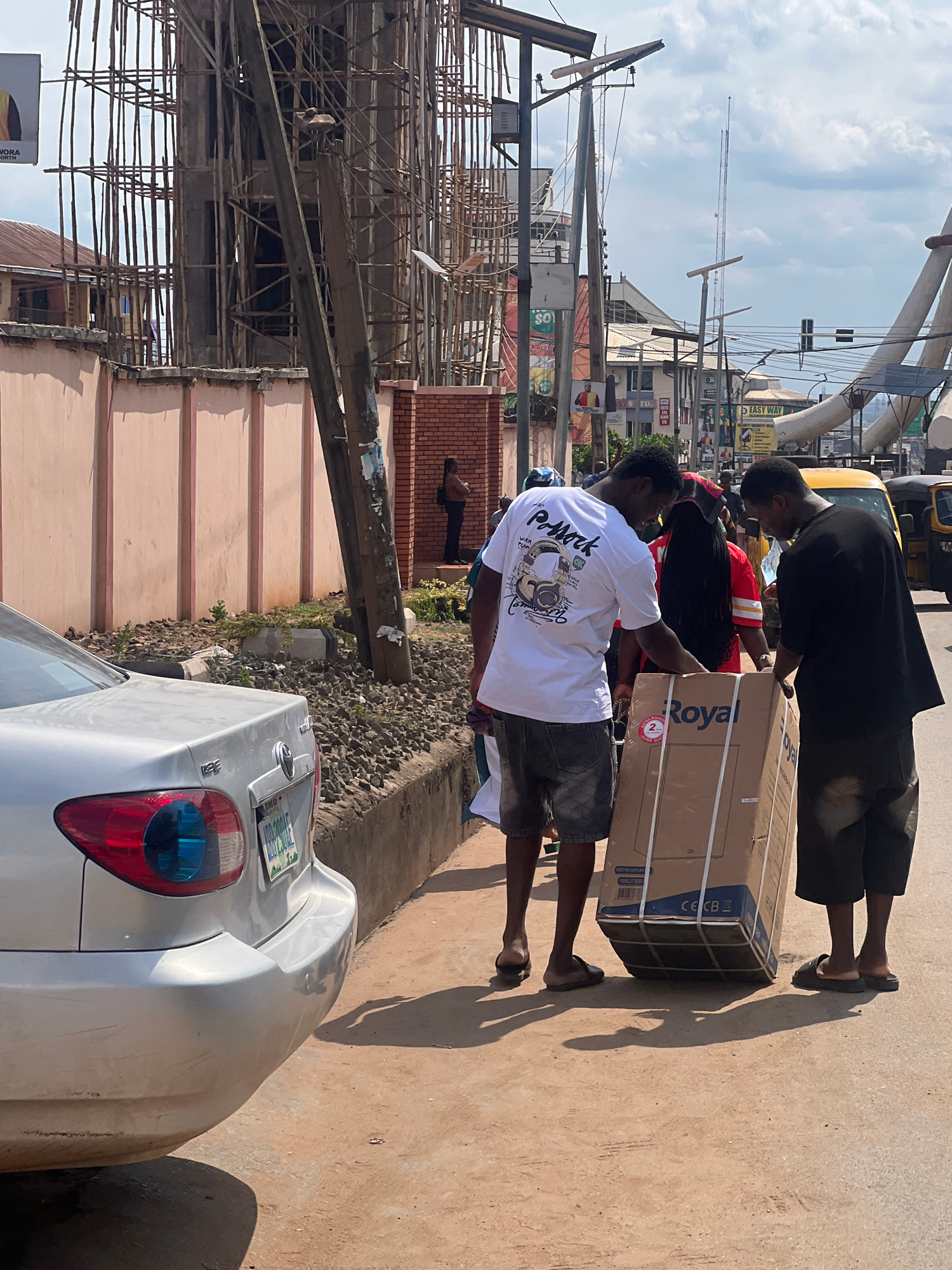 The image depicts an active street scene in an urban area of Onitsha, Nigeria, under bright daylight. Three men are the primary subjects, focused on transporting a large, rectangular cardboard box alo…read more