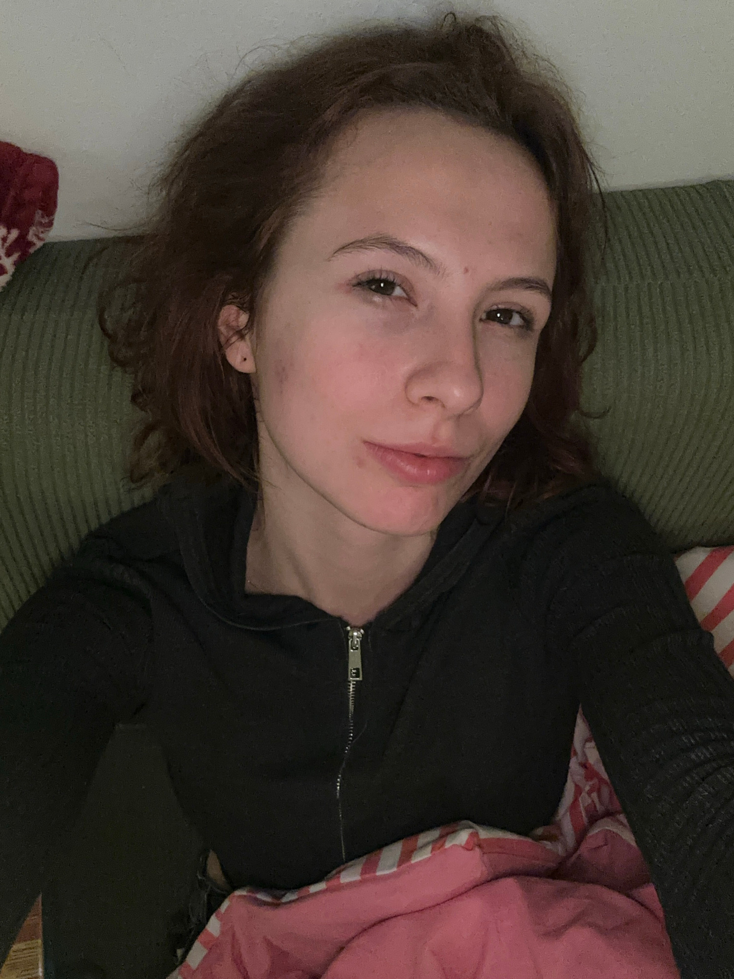 A woman with brown hair and fair skin is lying down. She is wearing a black zip-up top. She is partly covered by a pink and white striped blanket. She is lying on a green textured surface, possibly a…read more