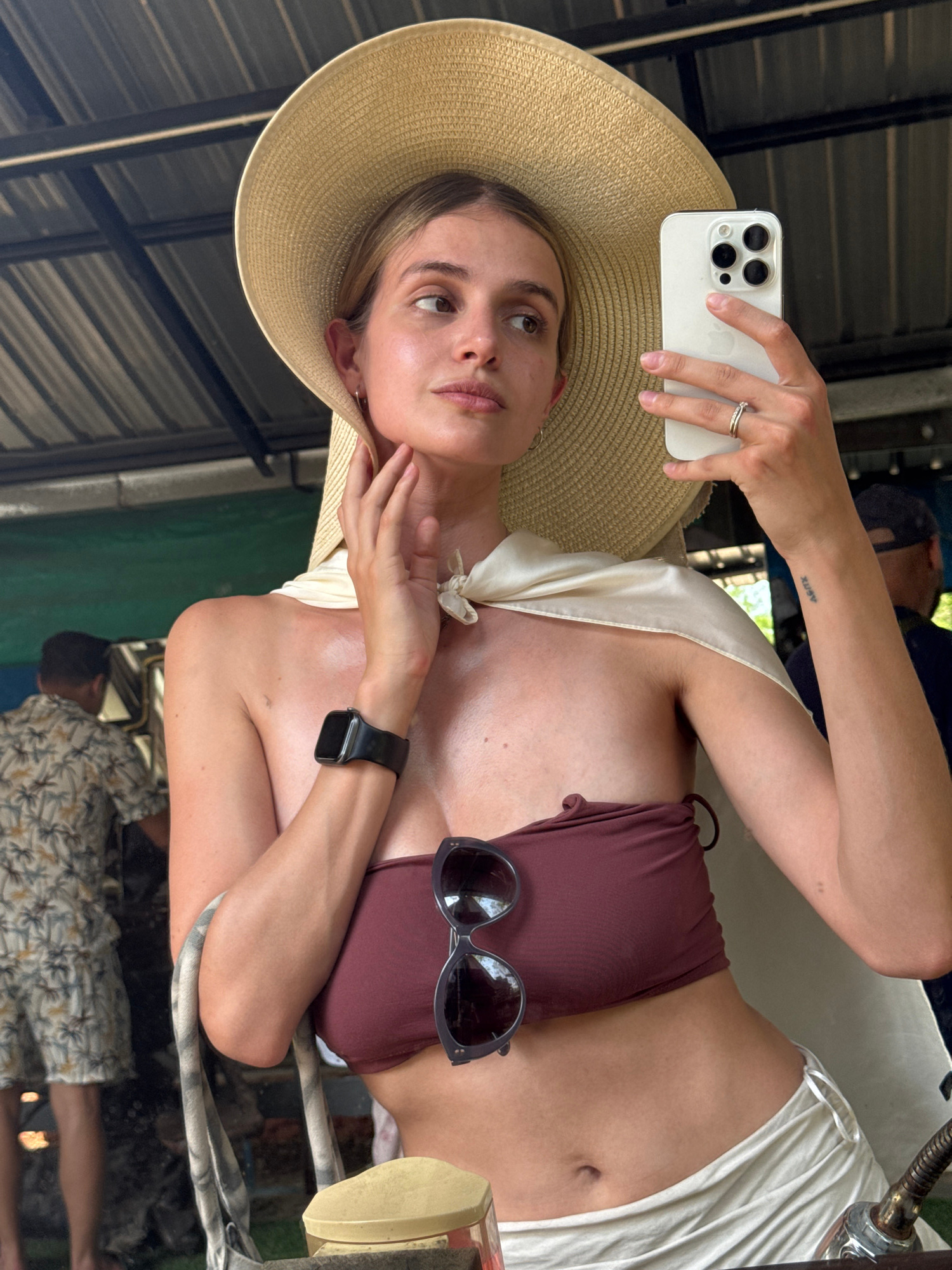 A woman takes a selfie outdoors with an iPhone, wearing a wide-brimmed straw hat and a maroon bikini top. Sunglasses are perched on the bikini top. She has fair skin, light brown hair, and a tattoo on…read more