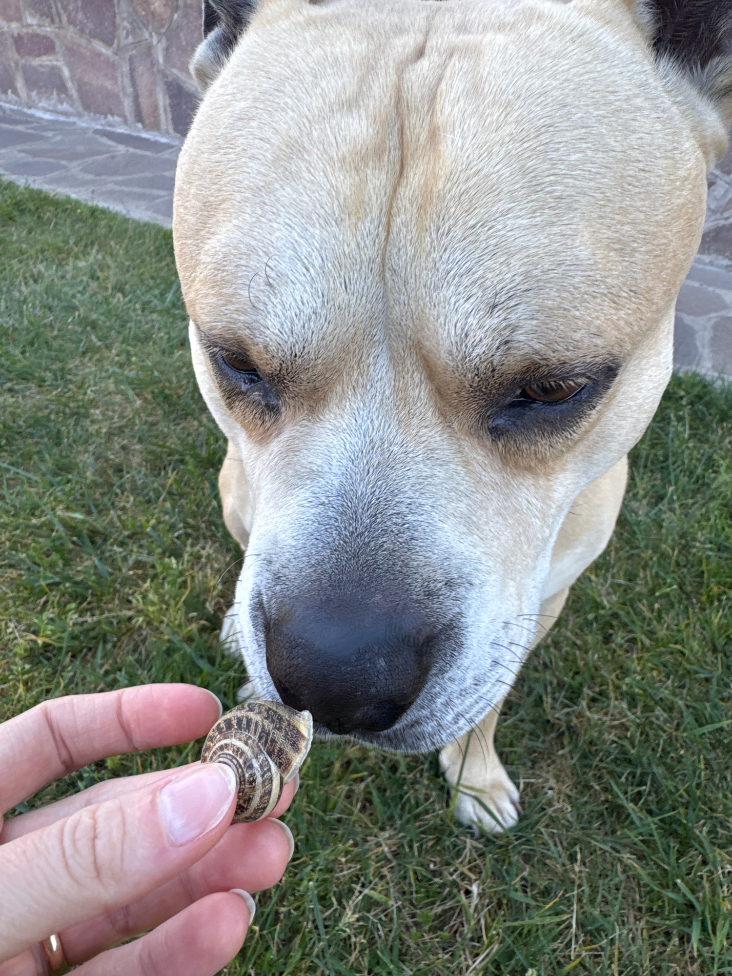 A close-up, high-angle shot shows a light-tan dog's head near a hand holding a snail. The dog is mostly in focus, with its snout near the snail. The dog has dark eyes and a black nose. The hand holdin…read more